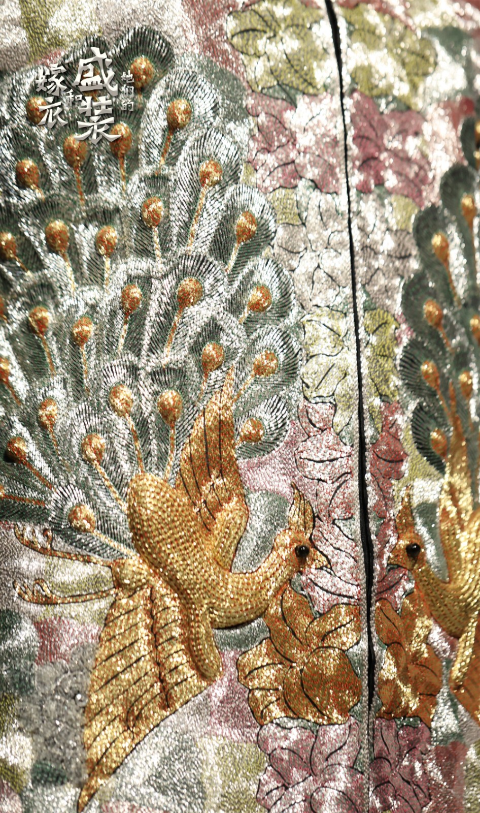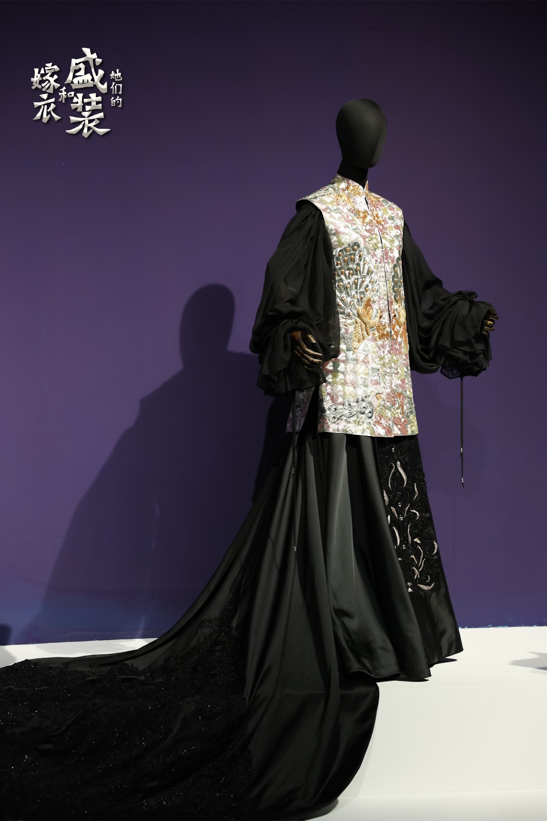 “凤兮”系列礼服由中式服装制作技艺(钉金绣裙褂制作技艺)传承人唐志茹、邓启荣、邓子烨倾力打造,以不同的款式展示从凤凰雏鸟成长为凤凰的过程。“凤兮”系列礼服中的一件压轴展品为拖尾新中式礼服的孔雀褂皇,名为“有凤来仪”。作者希望以一个凤凰的成长过程,不断寻找当地的服饰文化与展览核心价值相符合的内容,借此传播美好的中华传统文化。