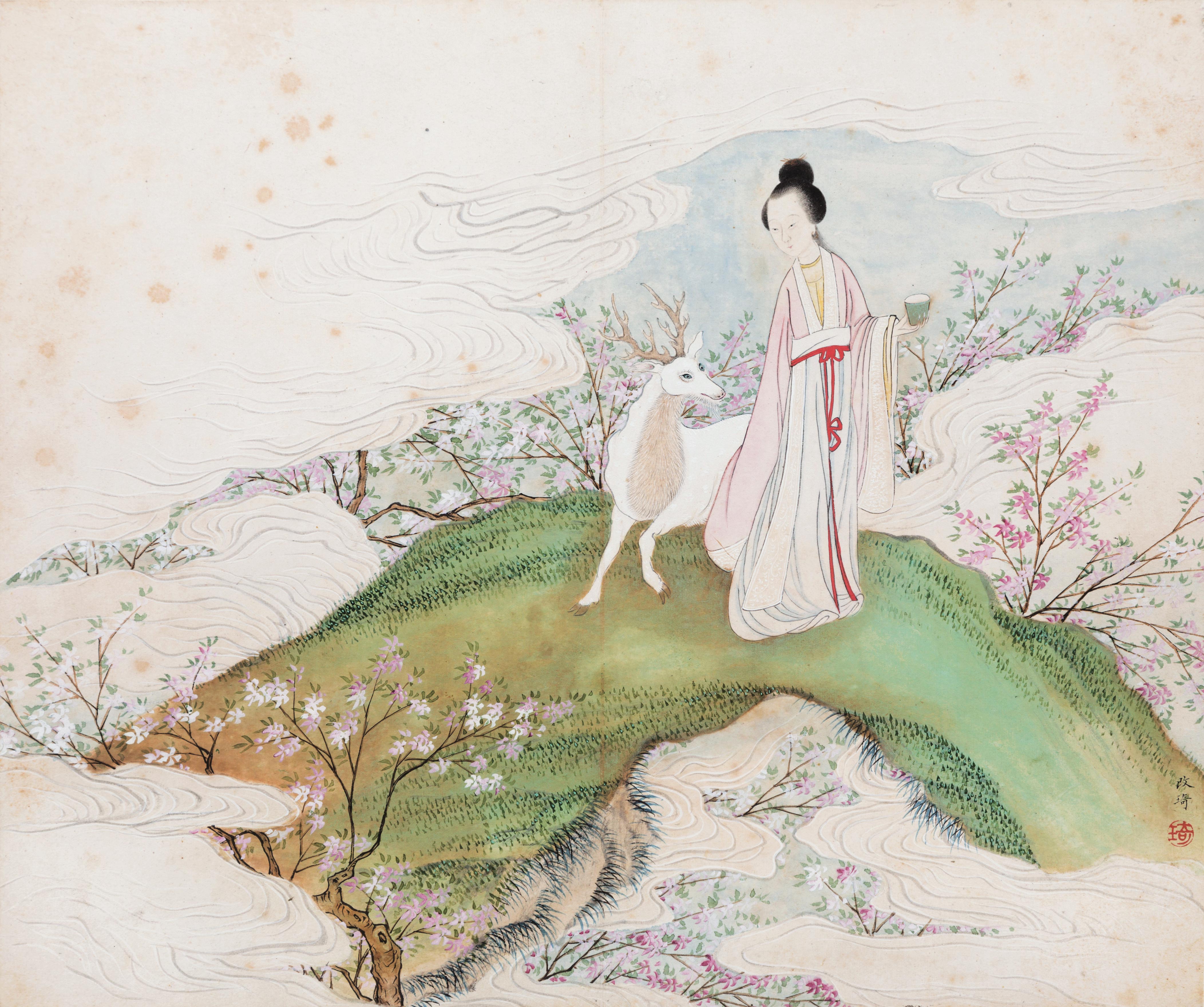 名称: 清改琦仕女册 年代: 清代 类型: 书法、绘画 质地: 纸 尺寸: 纵 28 厘米,横 33.5 厘米 来源: 广东省博物馆 改琦(1774 ─ 1829),字伯蕴,号香白,又号七芗、玉壶山人、玉壶外史、玉壶仙叟等。清代画家,上海松江人,宗法华喦,喜用兰叶描,仕女衣纹细秀,树石背景简逸,造型纤细,敷色清雅,创立了仕女画新的风格,时人称为“改派”。工人物、佛像,笔意秀逸潇洒,其画花鸟、山水、兰竹等吸取前人之长,亦有一定造诣。