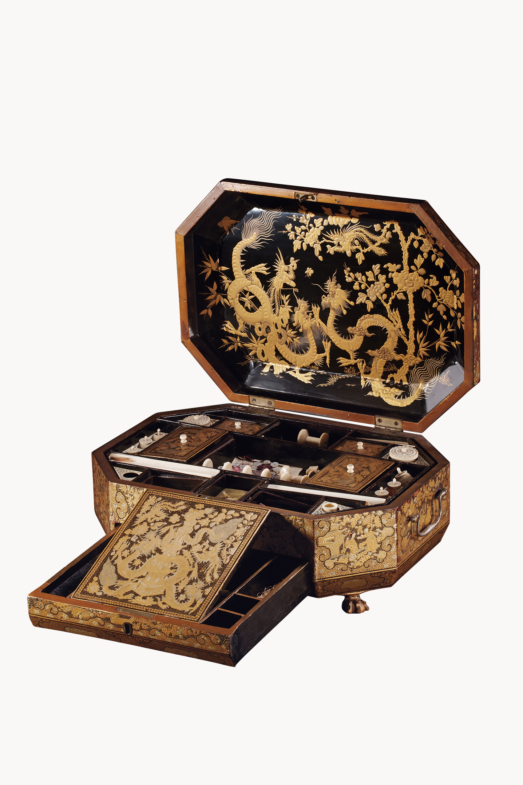 木胎,带盖,八角长方形,底承四兽足,通体黑漆描金堆漆装饰。盖面四组双龙戏珠环绕中心开光,内绘亭台楼阁、水榭佛塔、风景人物;周身满饰花草、鱼子纹地,海棠形开光内绘亭台楼阁、舞龙戏狮、庭院人物场景;盒身两侧各配一金属提手;盖内部黑漆地堆金绘龙凤、花卉、竹蝶纹;盒内十九个隔断大小不一,以描金绘板为盖,内承二十七件象牙制纺锤、线轴、线梭、顶针等女红工具;底层设一狭长抽屉,配置锁孔及钥匙,抽屉内设大小六格,屉面堆金绘花卉龙凤。该盒造型规整大气、工艺精湛、立体感强,给人雍容华贵之感。