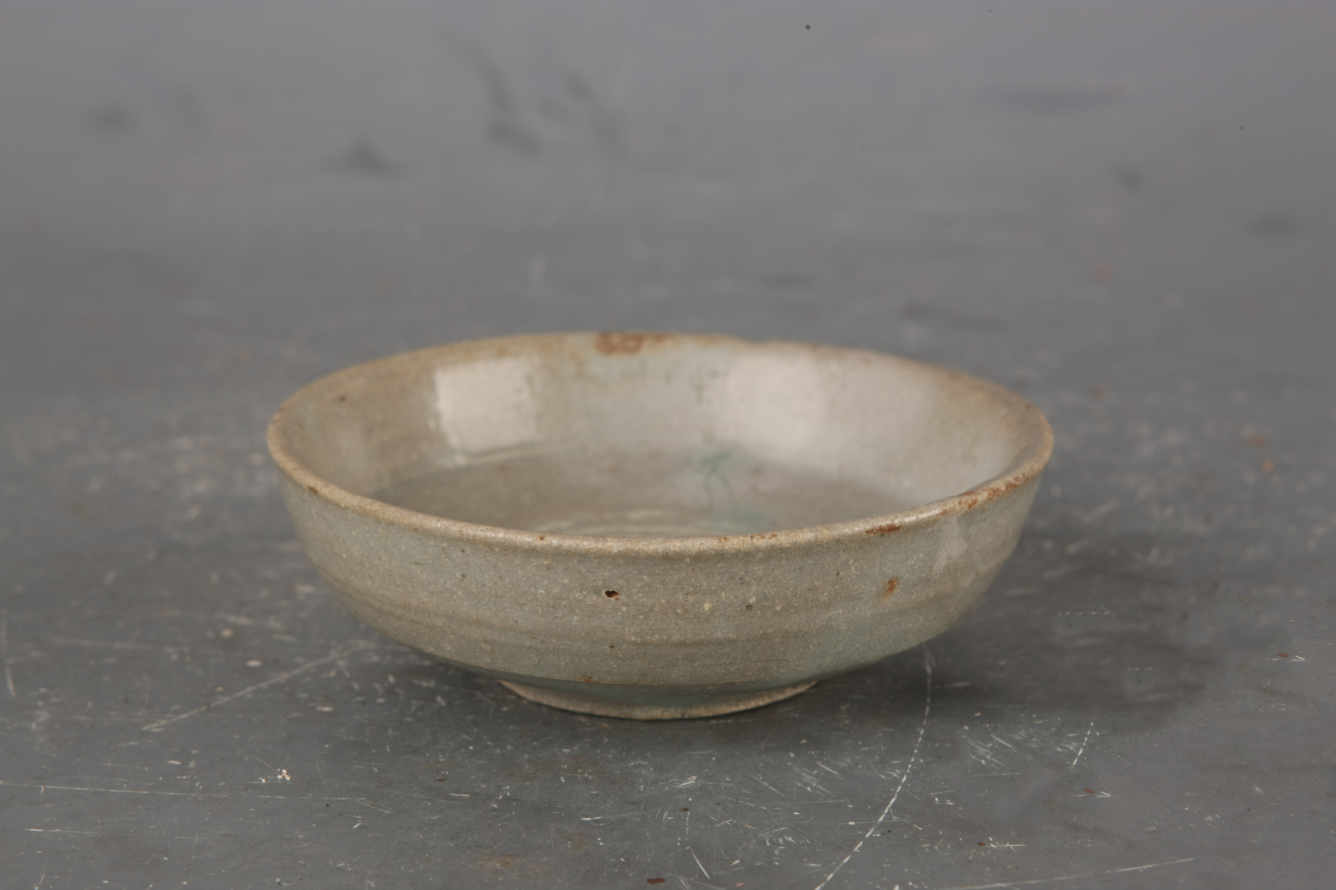 名称: 朝鲜青釉小盏 年代: 12-13世纪 类型: 质地: 瓷 尺寸: 高3.5厘米,口径10.9厘米,底径4.5厘米 来源: 广东省博物馆 撇口折腰,浅圈足。内底饰白弦纹六道,施青釉,底足无釉为沙底。