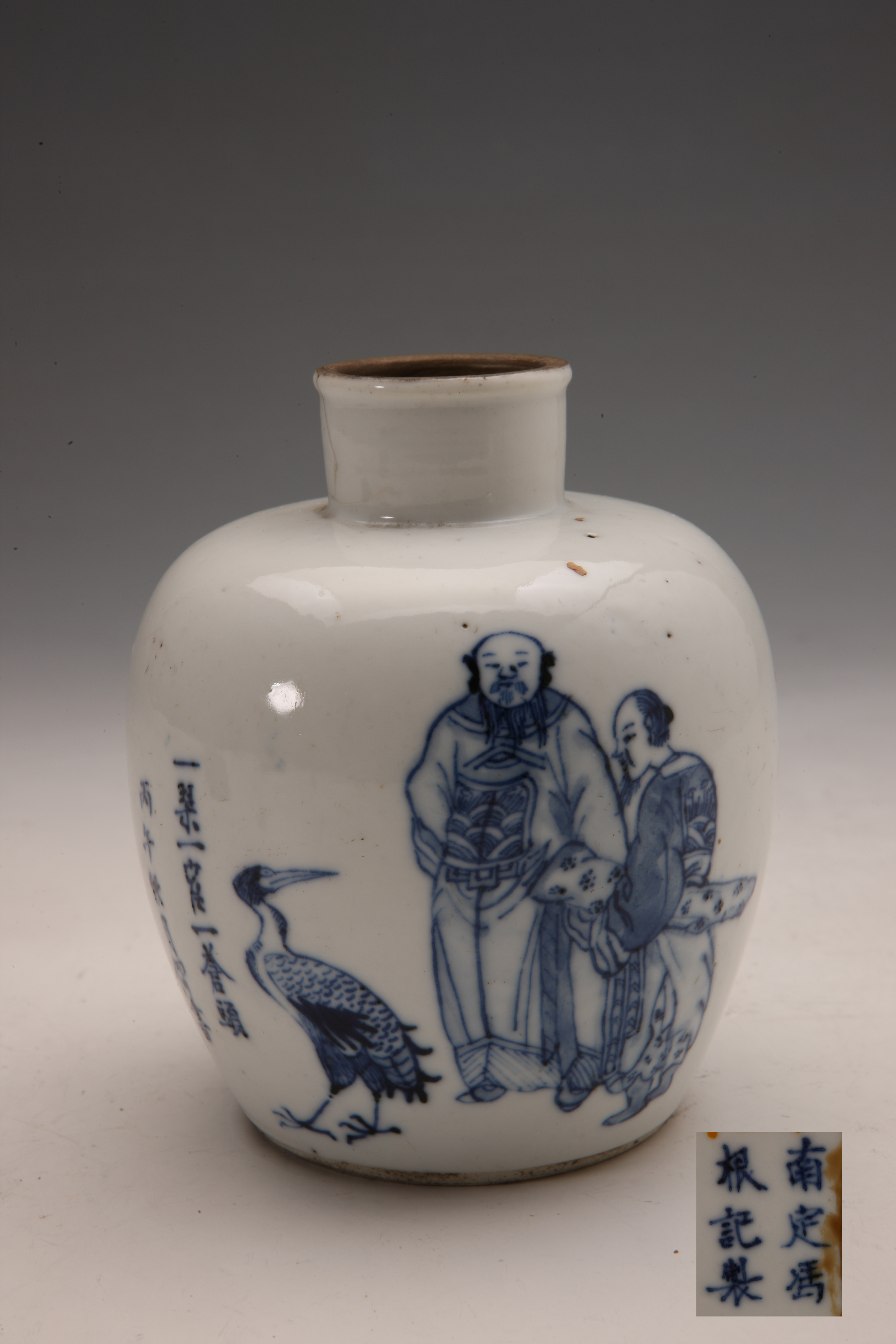 罐小口,丰肩,鼓腹,足内以青花书写“南定冯根记制”款。腹部一面绘“一琴一鹤”典故图。“一琴一鹤”的典故,出自《宋史.赵抃传》。北宋赵扑,为官清廉,人称“铁面御史”。其赴任四川成都转运史,随身只带一 琴一鹤。后人用“一琴一鹤”称颂为官清政、 廉正不阿,也用以称领品德高尚者。画面还配以诗文“一琴一鹤一苍头,丙午秋月偶书”,并绘一束兰花,配以小篆体诗文“特兰都幽安,心聲忘目说”。古人崇尚兰花,也以兰花象征淡漠、高话、贤德的高责品格