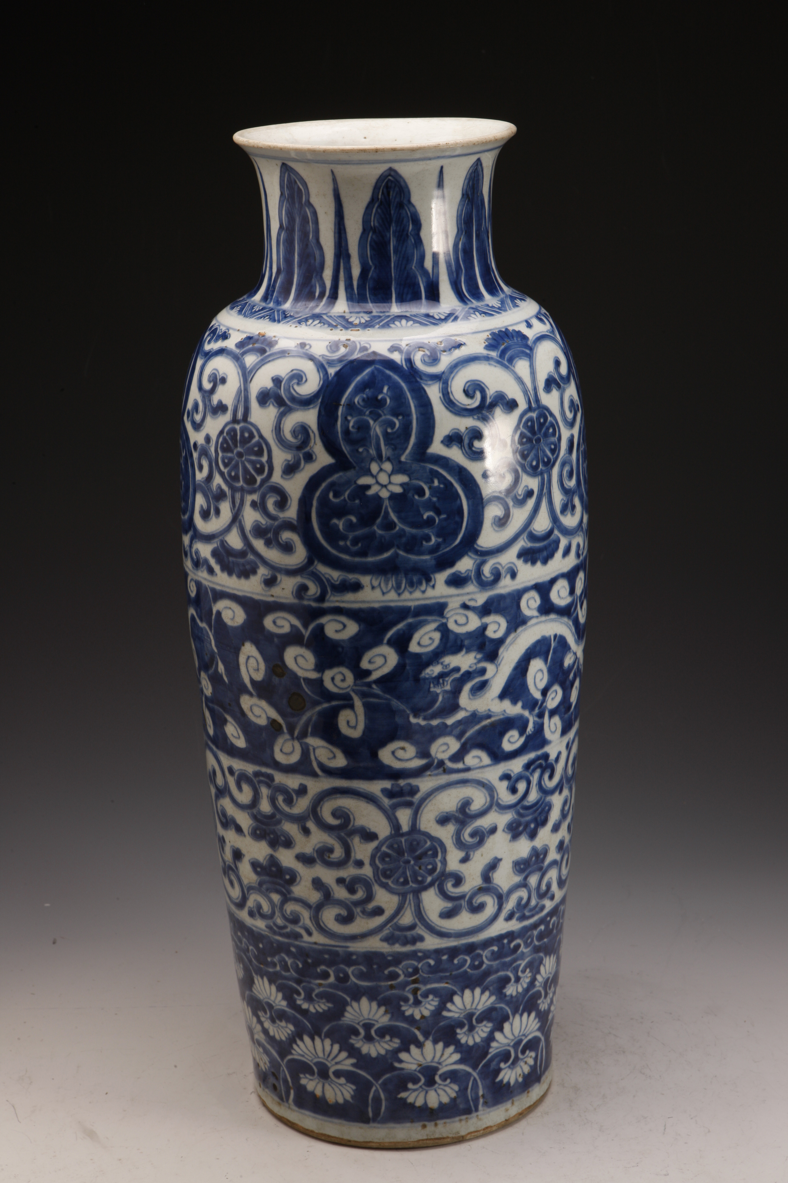 名称: 清青花夔龙瓶 年代: 清·康熙 类型: 质地: 尺寸: 高58.4厘米,口径14.5厘米,底径17.3厘米 来源: 广东省博物馆 瓶撇口,短颈,长直腹,圈足。颈部绘蕉叶纹,肩部饰三角锦地纹一周。腹部饰四层纹饰,分别绘如意开光缠枝莲纹、蓝地白龙纹、白地青花缠枝莲纹和蓝地白花卉纹。底白釉,饰青花双圈款。此瓶纹样丰满特别,基本不留白,特别的是绘有吊坠式纹样,即在如意云图案内再绘花草纹。此类纹样的瓷器多销往欧洲市场,流行于17—18世纪。