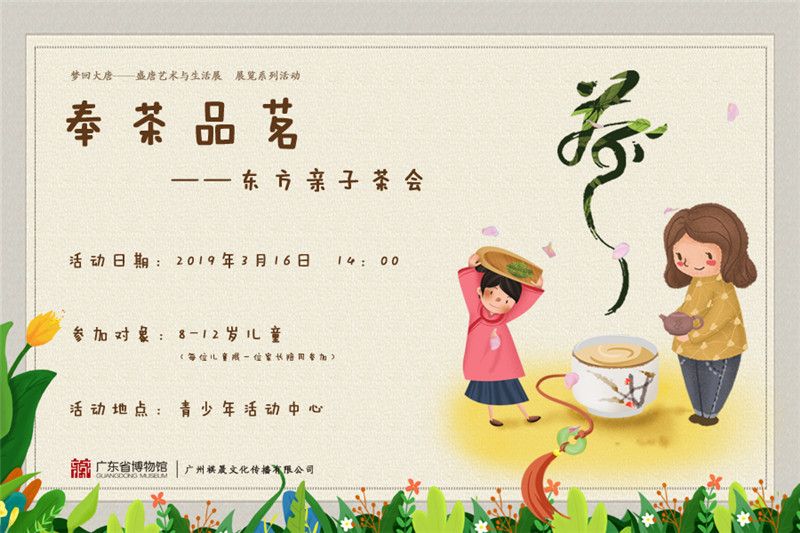 茶既可以是“柴米油盐酱醋茶”中的日常生活,也可以是“琴棋书画诗酒茶”中的雅事。唐代饮茶风尚兴起,节俗聚会时常常举行茶宴、茶会、茶集,吟诗联句,其乐无穷。又是一年花季到,春风得意,陌上花开,青草动人,莺歌燕舞……在最美的花季,邀请您和孩子与我们在粤博共度午后时光,在茶香、花香中习得中国人的待客之道,在片刻之间体会宁静的芬芳。【注意】活动参观为1小时内,需要更多参观时间的观众可凭票提前入场。本活动每个儿童名额仅限一位家长陪同。