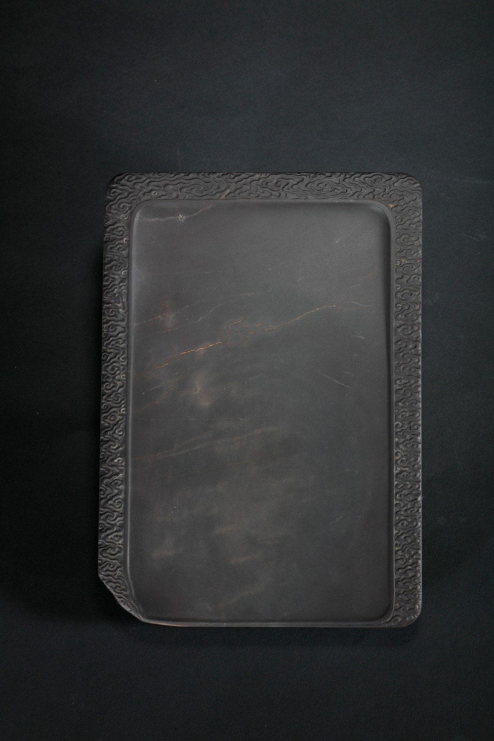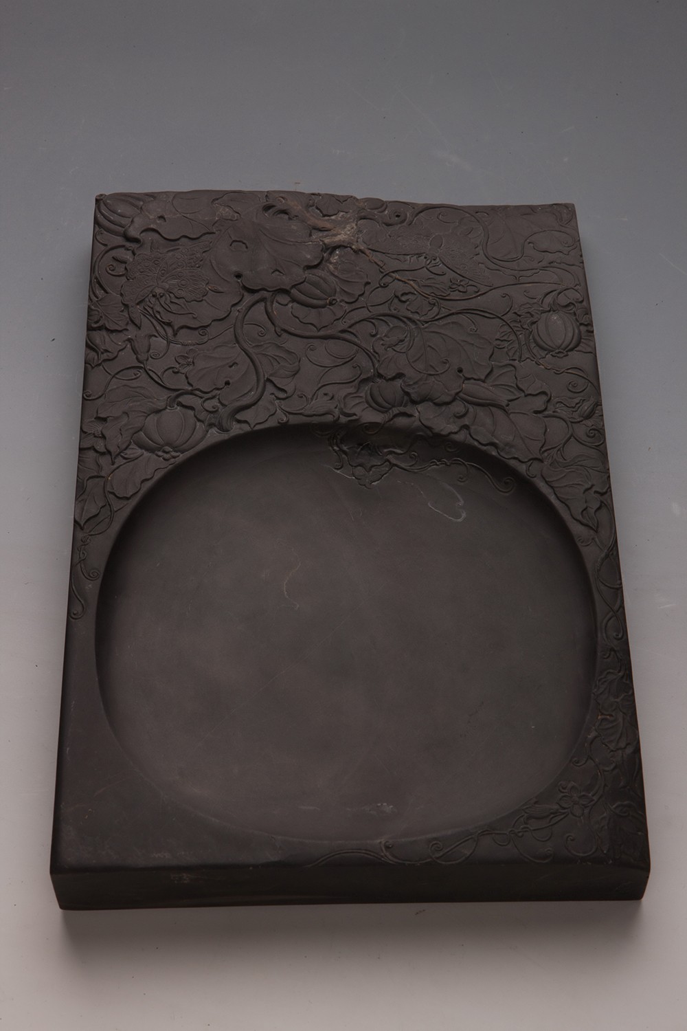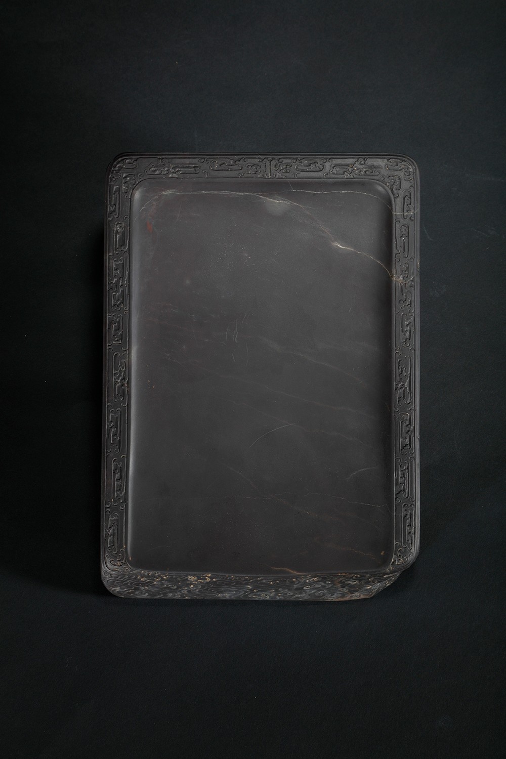 老坑水归洞石。长方淌池式双面砚。砚堂有大片鱼脑冻、天青。双面砚边分别雕刻卷云纹、夔纹。砚侧铭文:水归洞鱼脑冻九晕太极砚,光绪壬辰禺山何氏闲叟珍藏,项信南刊。