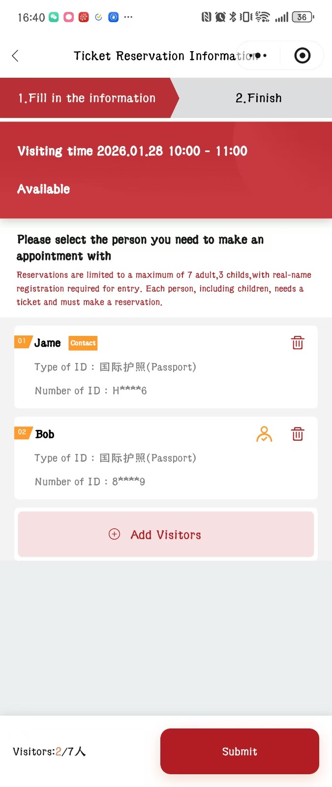 3. 如已完成用户注册,选择「已阅读须知并同意」,进入分时预约页面;选择心仪的参观日期与时段,填写护照、港澳通行证等有效证件信息,同步添加随行人员;