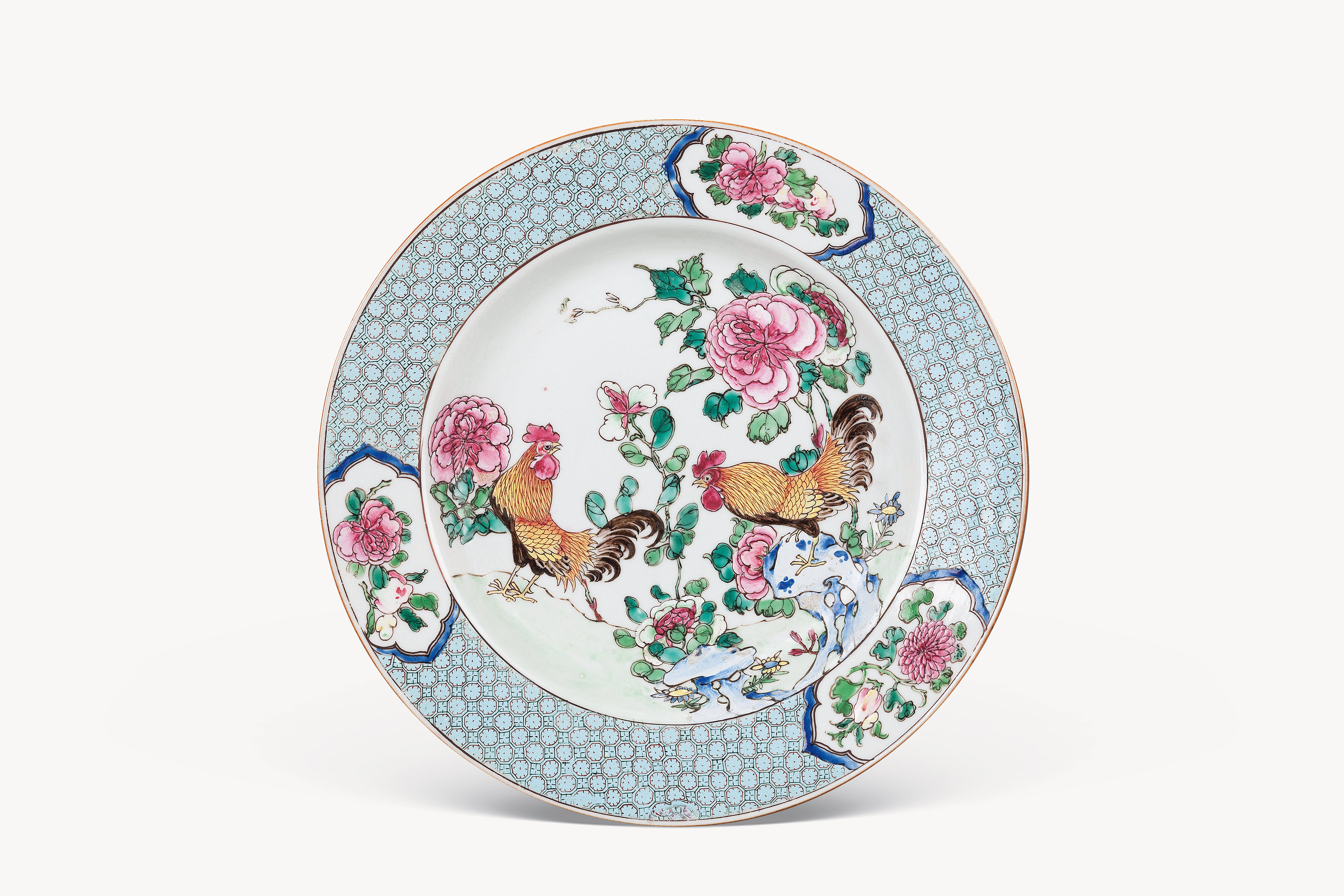 名称: 清乾隆粉彩富贵功名图瓷盘 年代: 清乾隆 类型: 瓷器 质地: 瓷 尺寸: 高 2 厘米,口径 22.1 厘米,底径 12.4 厘米 来源: 广东省博物馆 板沿,浅腹,圈足。板沿处绘蓝彩锦地纹,三组开光内绘牡丹、菊花纹。盘心绘牡丹、双鸡、山石等图案。