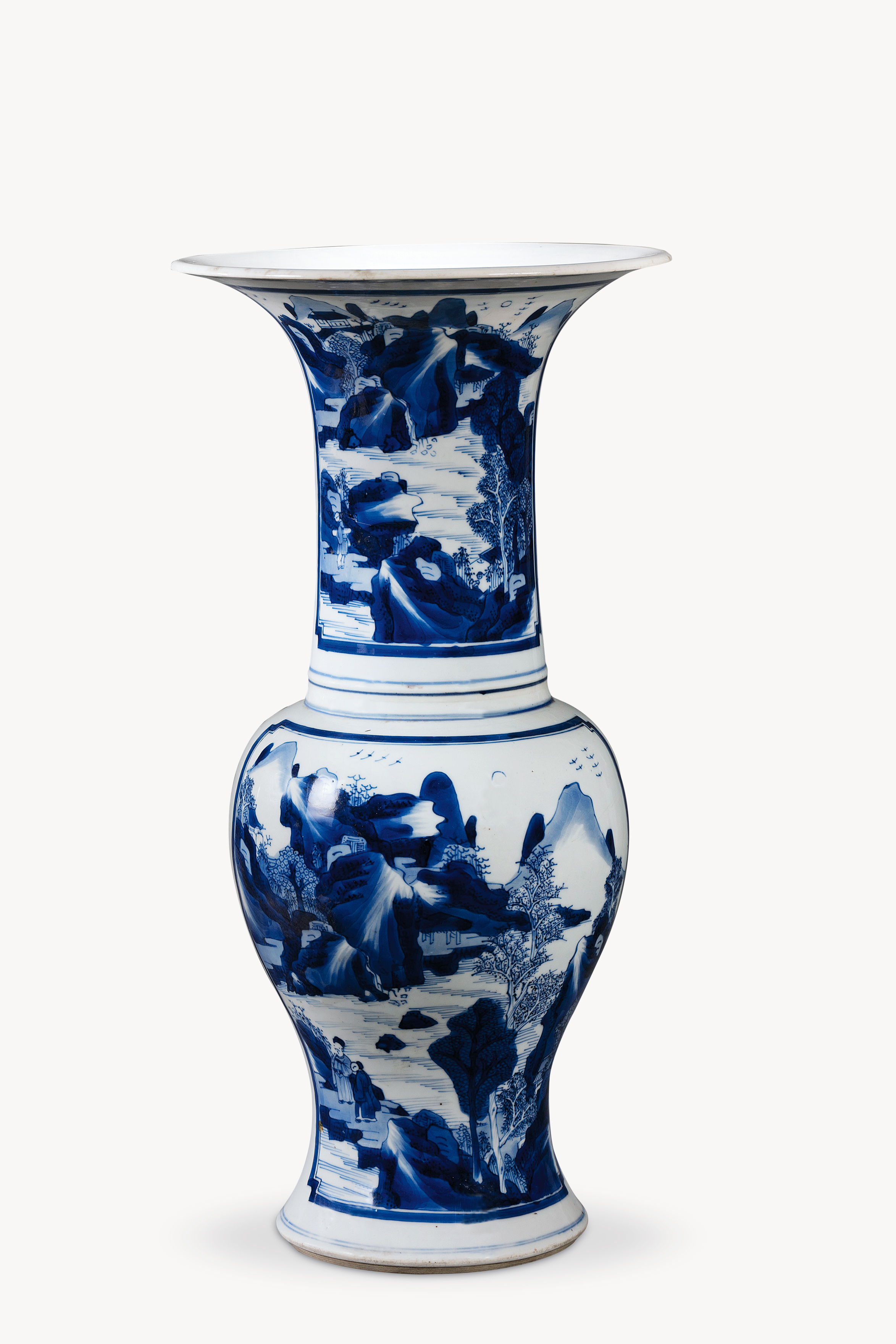 名称: 清康熙青花海兽山水瓷尊 年代: 清·康熙 类型: 瓷器 质地: 瓷 尺寸: 高 45.2 厘米,腹径 18.2 厘米,口径 22.3 厘米,底径 13.5 厘米 来源: 广东省博物馆 喇叭口,长颈,溜肩,鼓腹,腹下渐收,圈足外撇,台阶足颈部、腹部一侧开光内绘海水龙纹,另一侧绘山水人物图。