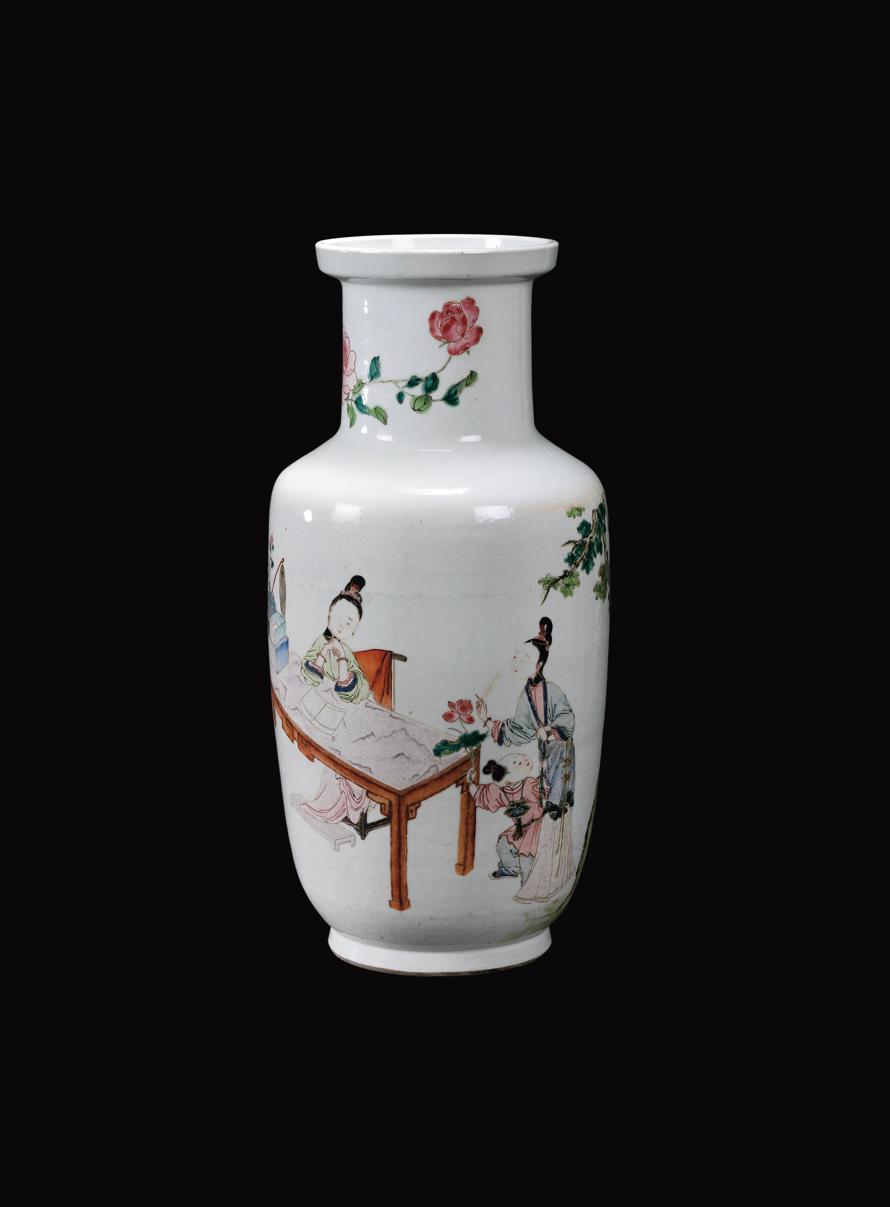 名称: 清雍正雍正粉彩人物瓷瓶 年代: 清雍正 类型: 瓷器 质地: 瓷 尺寸: 高 38.8 厘米,口径 12.9 厘米,底径 12 厘米 来源: 广东省博物馆 盘口,直颈,瓶腹呈筒形,圈足。颈部绘牡丹、菊花纹饰。腹部绘仕女戏婴图,施红、绿、黄、蓝彩。底无釉。