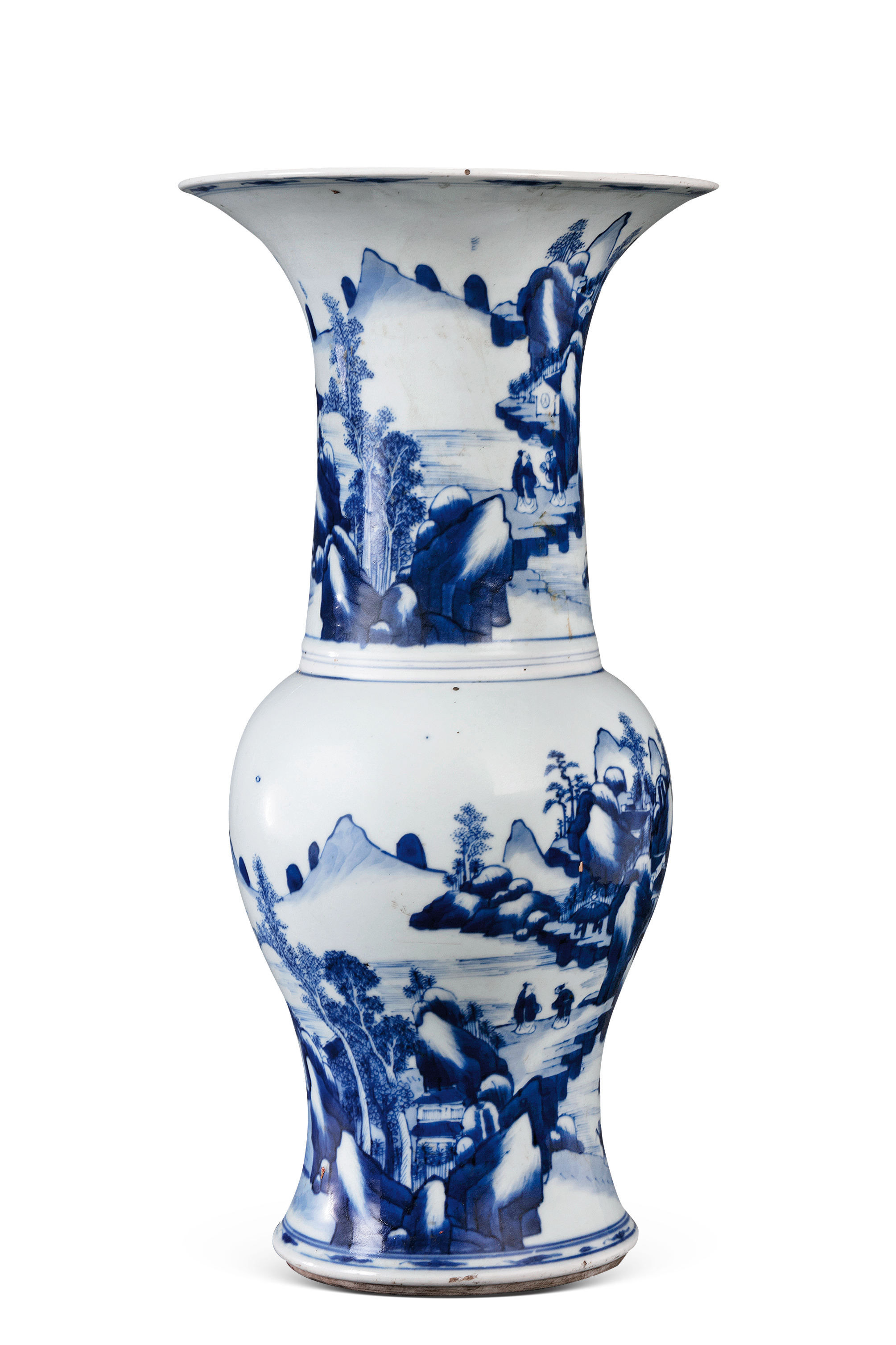 名称: 清康熙青花山水瓷瓶 年代: 清康熙 类型: 瓷器 质地: 瓷 尺寸: 高 45.4 厘米,口径 22.6 厘米,底径 15.5 厘米 来源: 广东省博物馆 撇口,长直颈,鼓腹渐收,近足处外撇,两层台圈足,颈、腹绘青花山水纹。