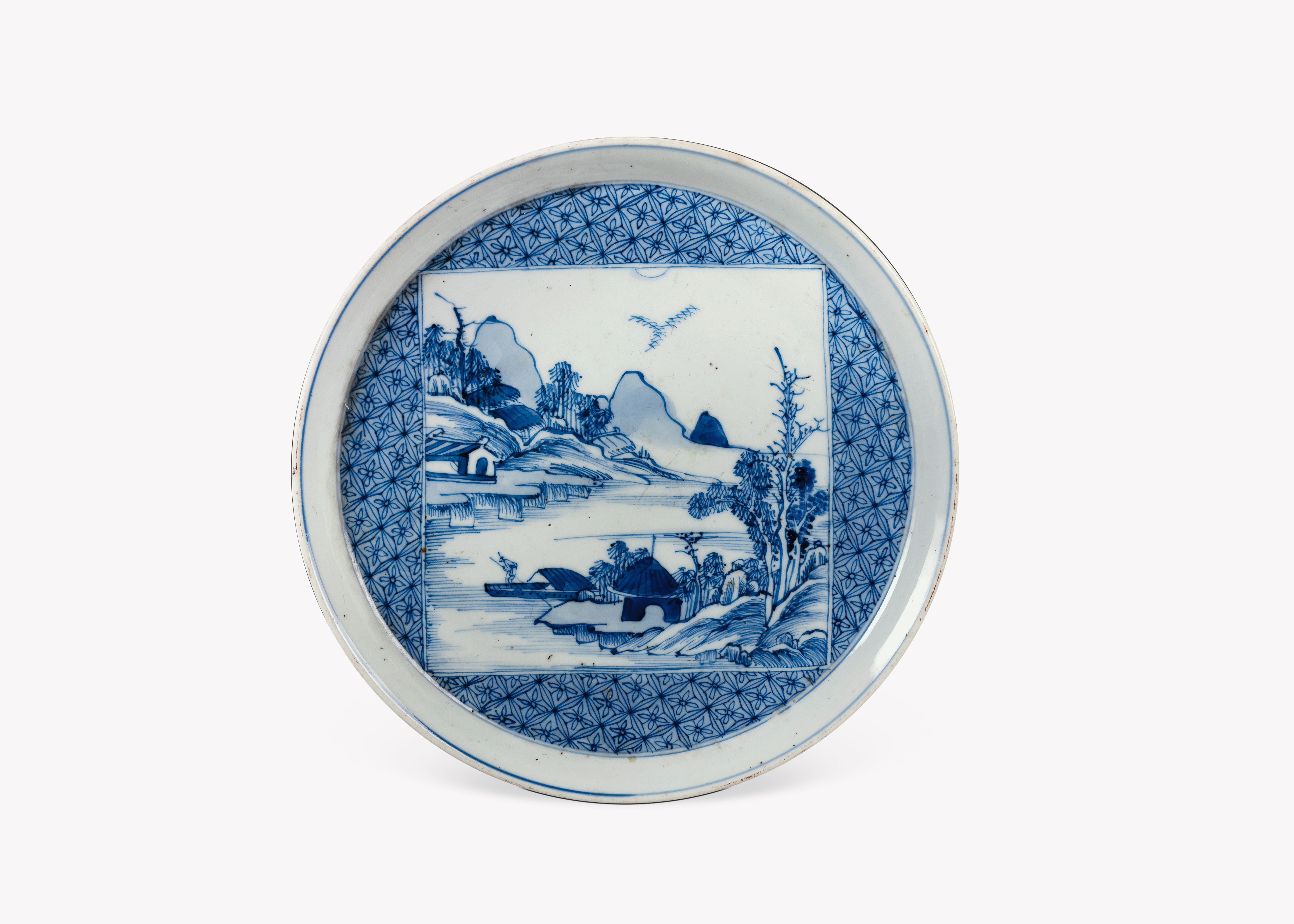 名称: 清仿宣德款青花山水圆瓷盘 年代: 清 类型: 瓷器 质地: 瓷 尺寸: 高 3 厘米,口径 24.6 厘米,底径 18.6 厘米 来源: 广东省博物馆 敞口,圆盘,圈足,盘府较厚,盘内绘青花开光山水风景图,开光外绘锦地,底书“大明宣德年制”青花双圈楷书款,为清仿明的作品。