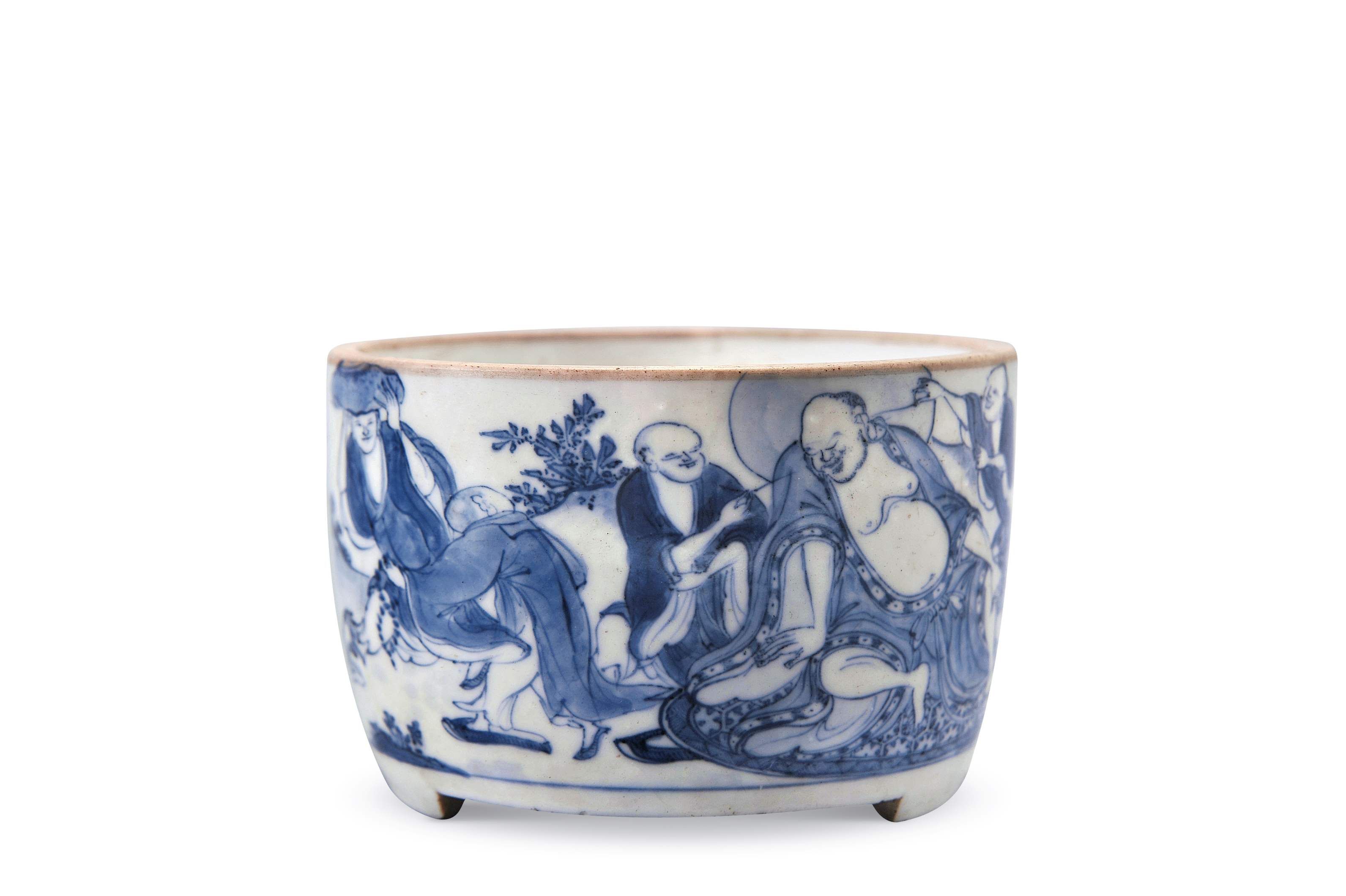口微敛,直筒腹,底承三足,腹部青花绘戏佛图。