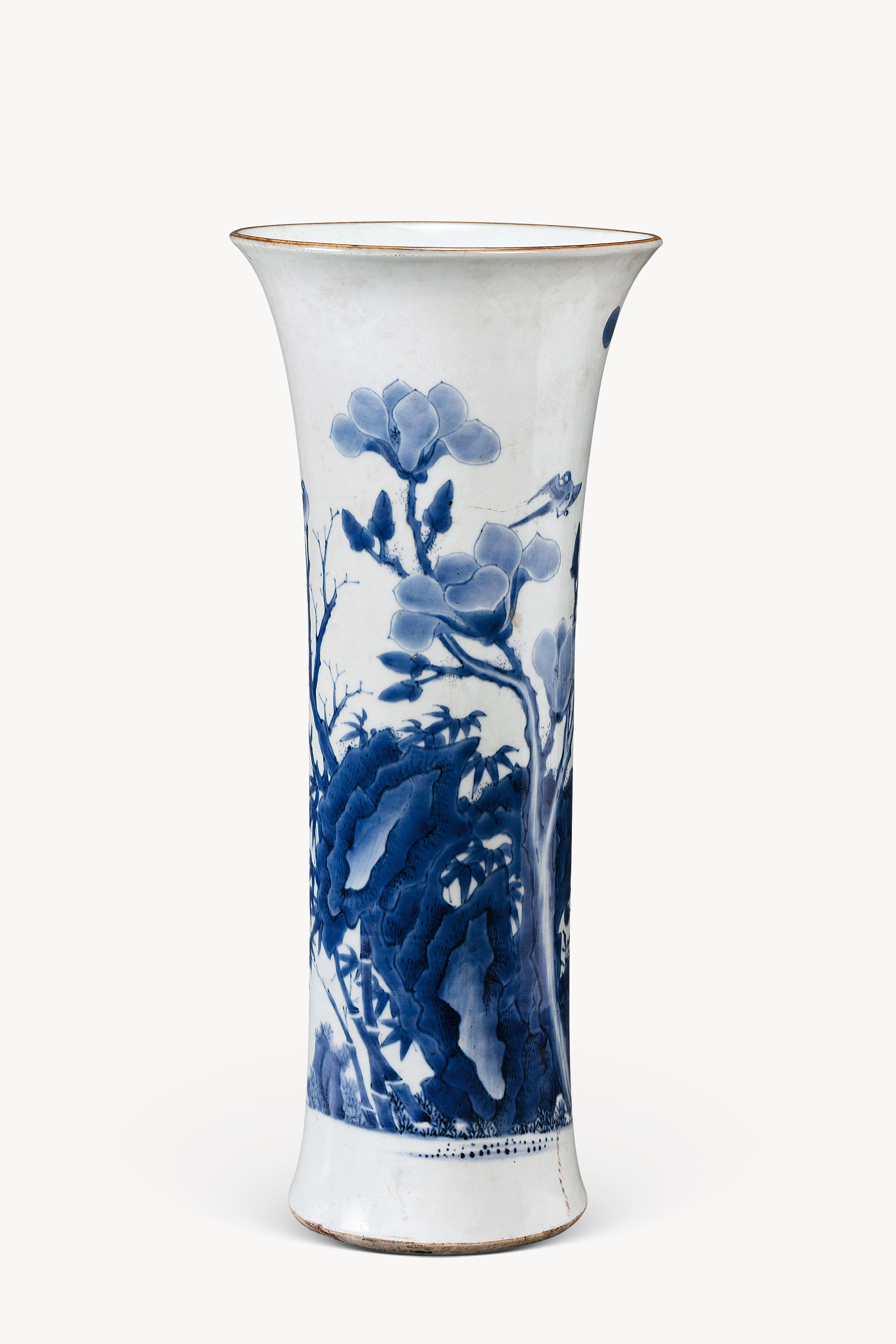 名称: 清康熙青花玉兰竹石瓷尊 年代: 清康熙 类型: 瓷器 质地: 瓷 尺寸: 高 45.5 厘米,腹径 13.5 厘米,口径 19.5 厘米 来源: 广东省博物馆 撇口,筒形,足外撇,平底,腹部绘青花花鸟纹,纹饰有兰、石、竹、鸟和牡丹等。