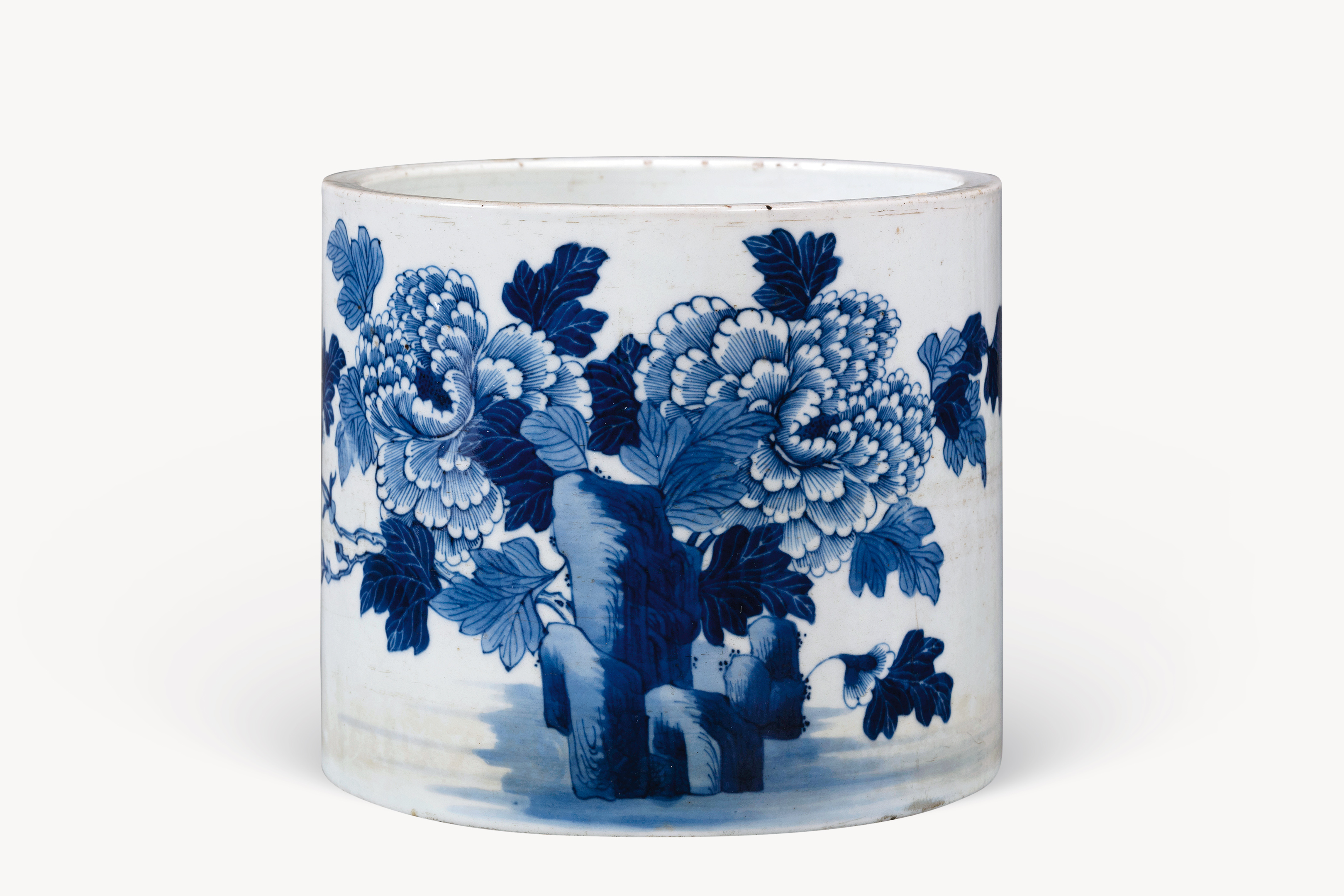 名称: 清雍正青花花卉大瓷笔筒 年代: 清雍正 类型: 瓷器 质地: 瓷 尺寸: 高 10.5 厘米,口径 19.2 厘米,底径 19.2 厘米 来源: 广东省博物馆 平口,直身,玉璧底。腹部主题纹饰为牡丹花卉。