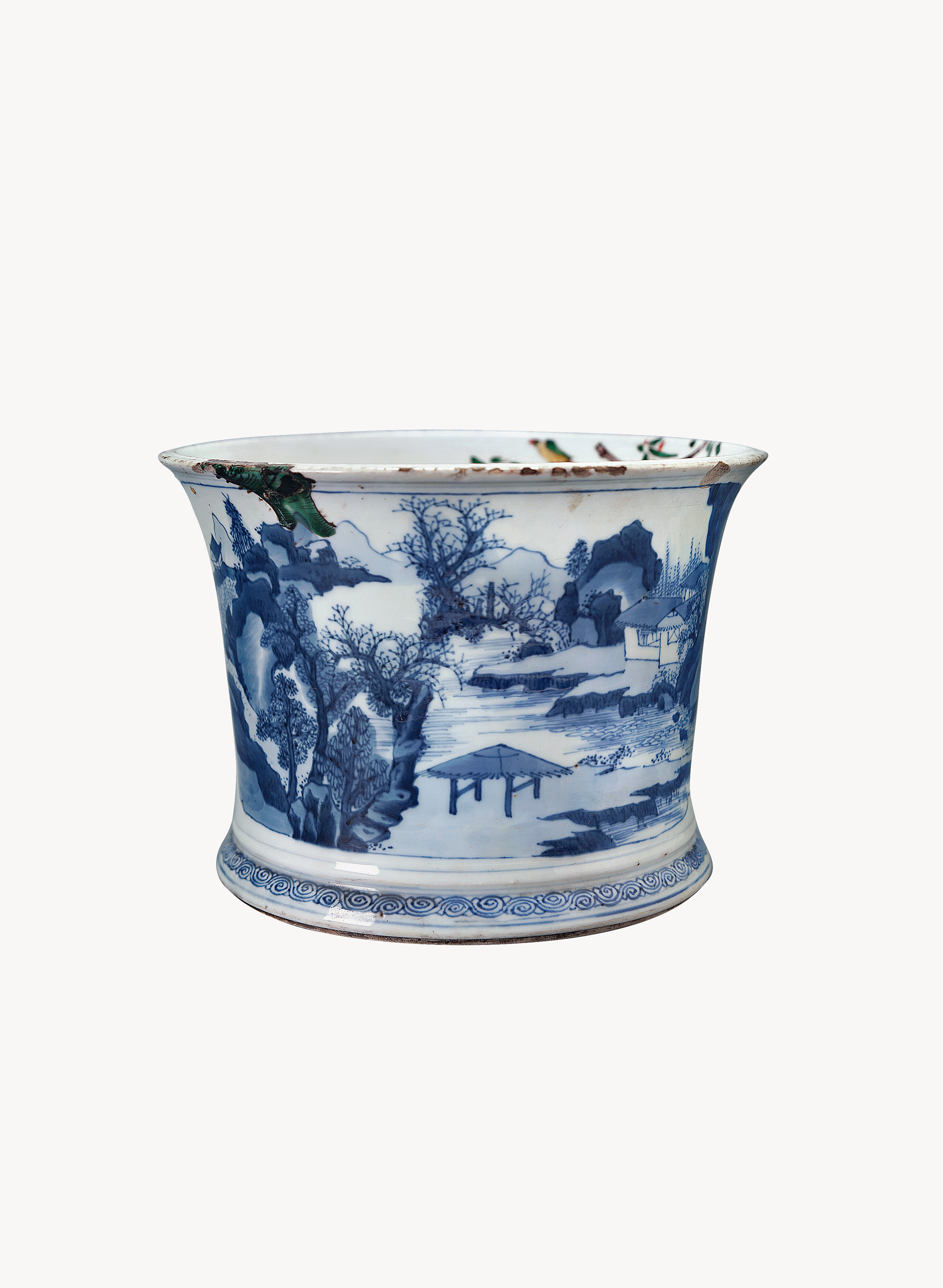名称: 清康熙青花人物笔筒 年代: 清康熙 类型: 瓷器 质地: 瓷 尺寸: 高 14.4 厘米,口径 20 厘米,底径 16.5 厘米 来源: 广东省博物馆 撇口,直腹,圈足,外绘青花人物图,底足绘青花双圈,无款,口沿内部加绘五彩花鸟纹。