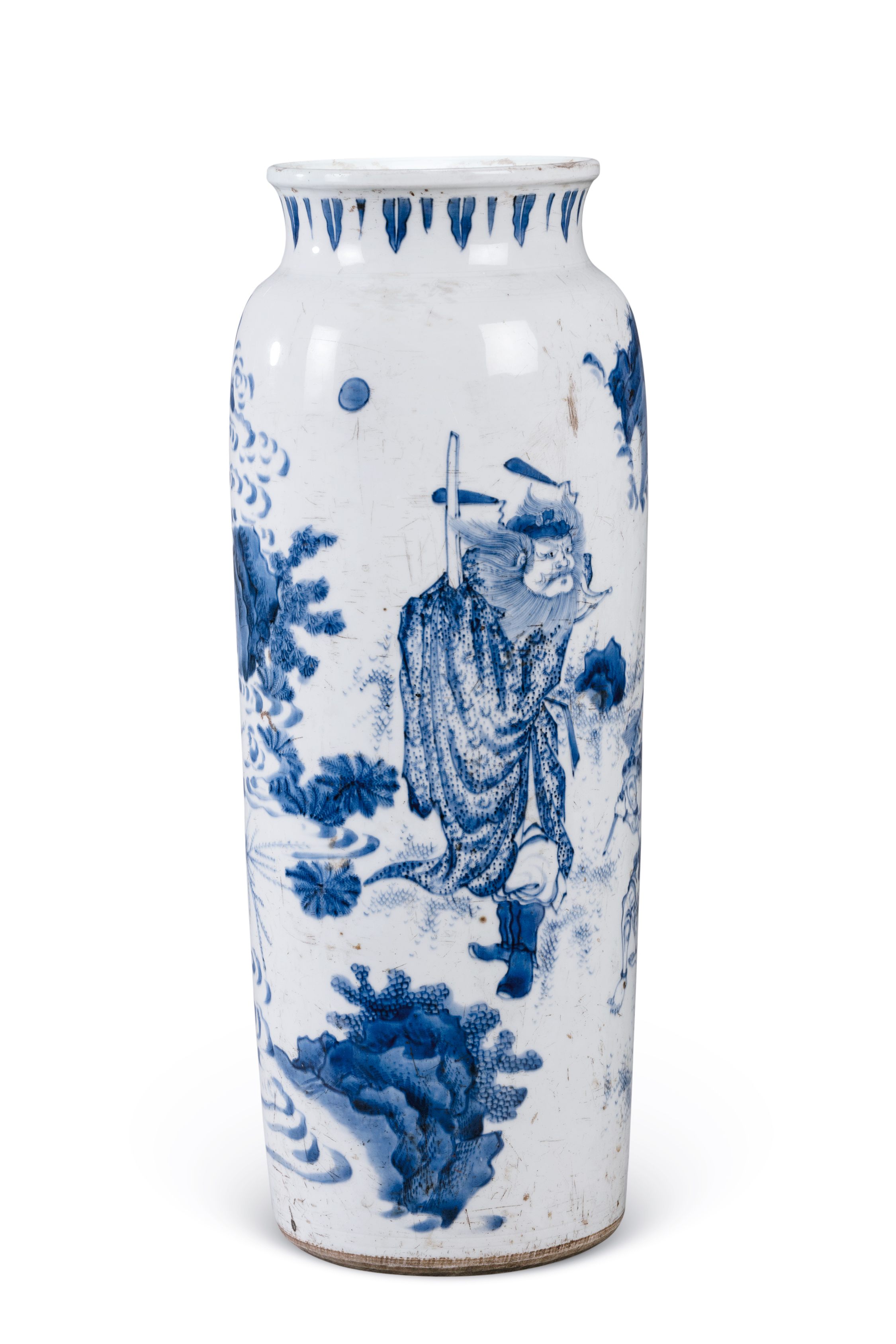 名称: 清康熙青花钟馗捉鬼桶子瓷瓶 年代: 清康熙 类型: 瓷器 质地: 瓷 尺寸: 高 34.4 厘米,口径 13.2 厘米,底径 13.4 厘米 来源: 广东省博物馆 敞口,束颈,筒腹,平足。腹部绘青花钟馗捉鬼图。