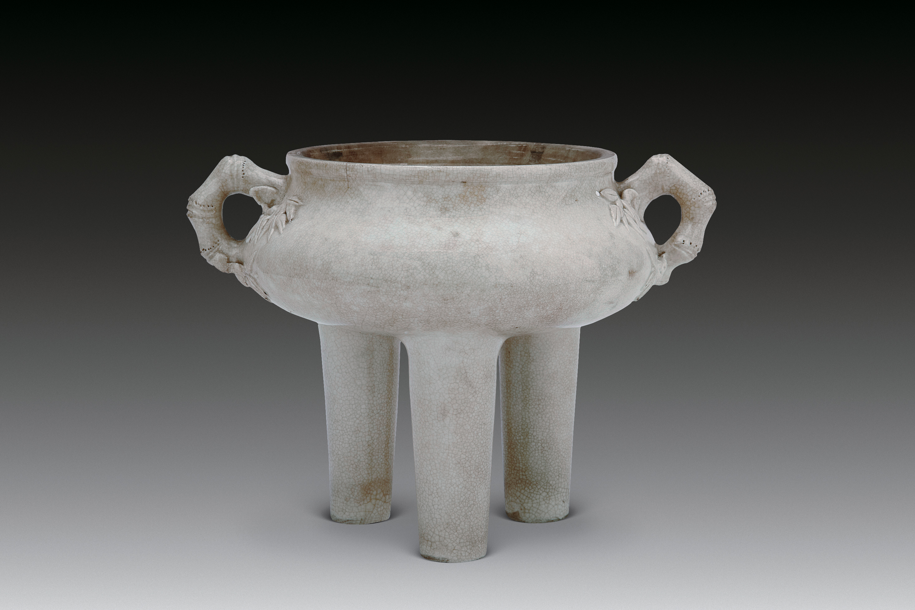 名称: 清潮州窑竹节耳三足瓷鼎 年代: 清代 类型: 瓷器 质地: 瓷 尺寸: 高16厘米,口径23.3厘米 来源: 广东省博物馆 方唇,微敞口,短颈,溜肩,扁圆鼓腹。通体施白釉,釉色泛黄,釉面莹润光亮并开细碎片纹。肩腹部饰对称竹节形半圆环状耳,耳上下端贴塑互对竹叶纹。底部设三圆柱形高足。