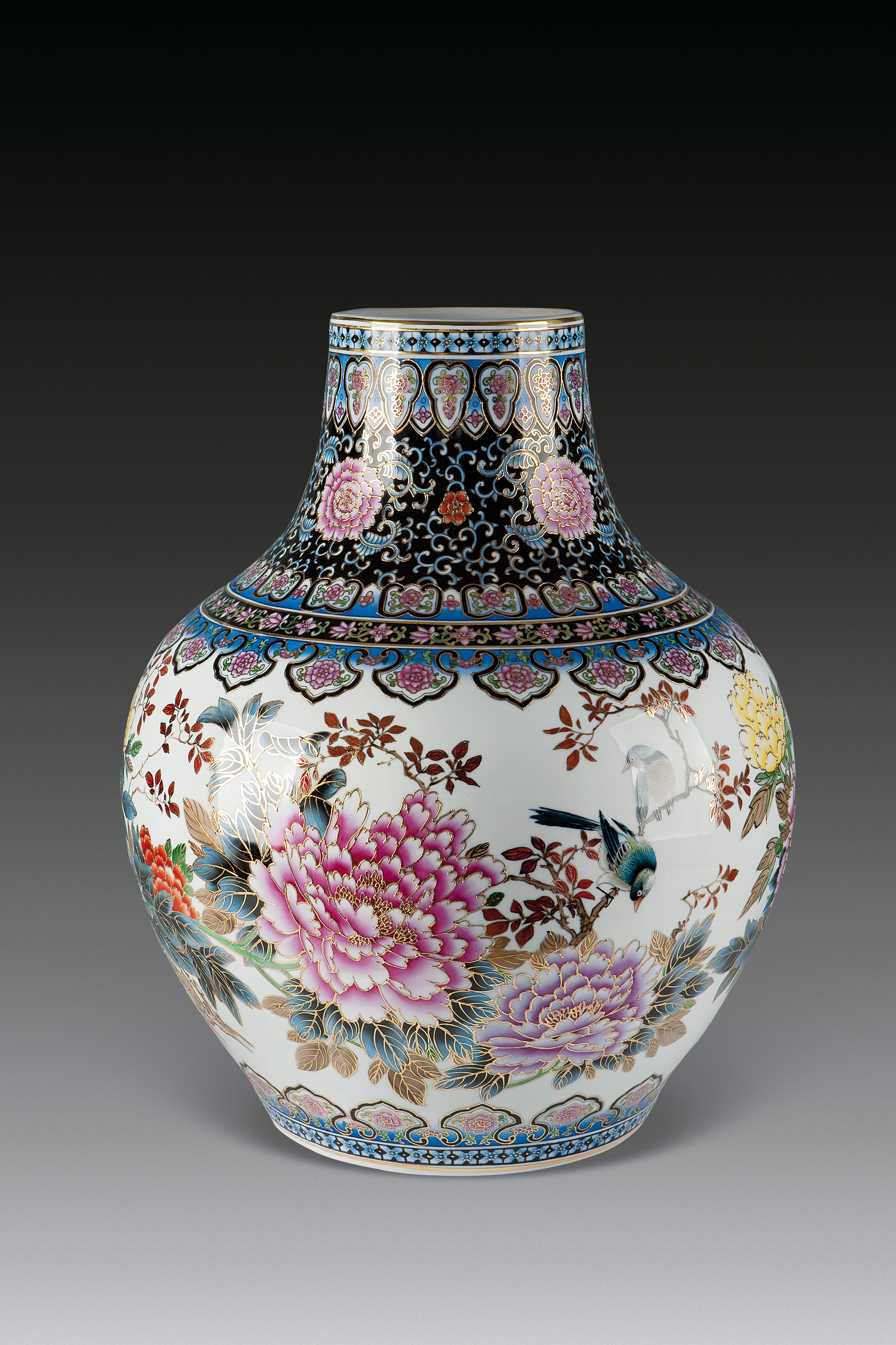 名称: 现代粉彩描金牡丹花鸟天球瓶 年代: 现代 类型: 瓷器 质地: 瓷 尺寸: 高60厘米,口径18厘米,底径29厘米 来源: 广东省博物馆 直颈、球腹。瓶颈、瓶足以多层图案装饰,腹部主体图案为通景牡丹花鸟纹,以堆塑描金勾勒牡丹花瓣轮廓。底有设计者陈仰中墨书款。