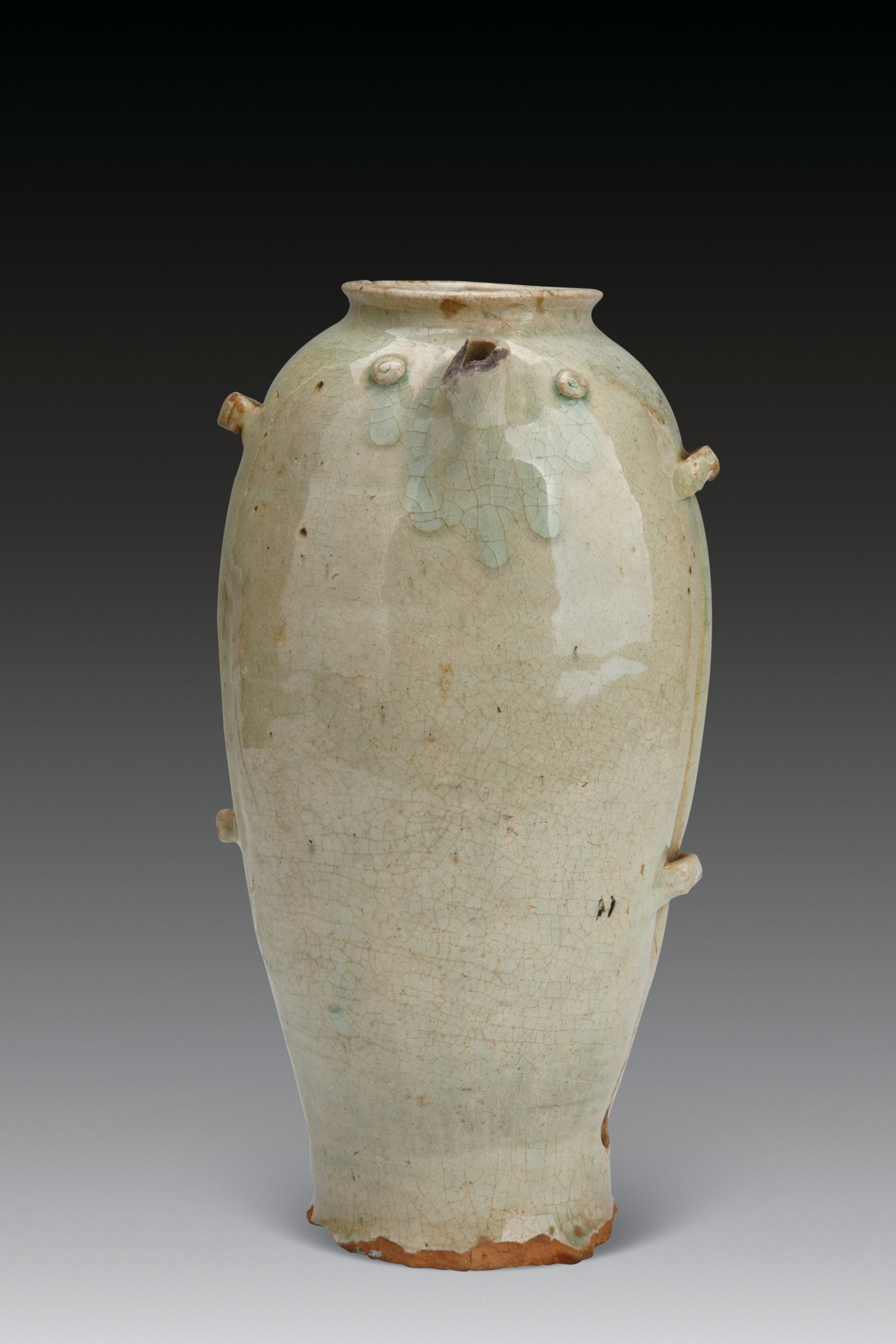 名称: 唐代青釉鱼形壶 年代: 唐代 类型: 瓷器 质地: 瓷 尺寸: 高27厘米, 口径7.5厘米,底径9厘米 来源: 广东省博物馆 卷口,短颈,长身似鱼形,圈足微外侈犹如鱼尾。肩附一短流,身有对称凹槽,凹槽上下各装两系,两侧各贴两鱼眼。满施青釉,釉色青绿,玻璃质感强。