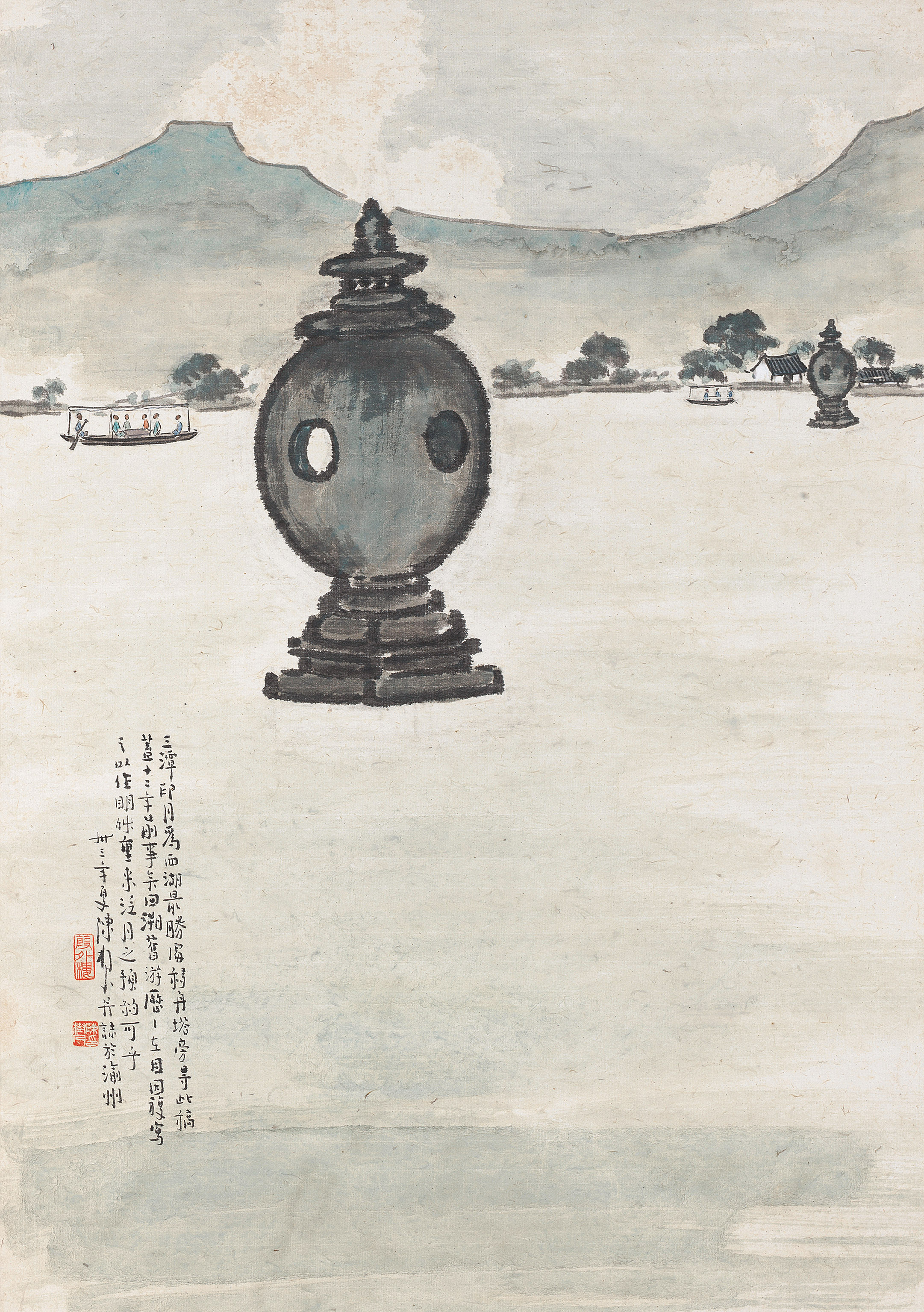 名称: 陈树人三潭印月轴 年代: 现代 类型: 书法、绘画 质地: 纸 尺寸: 83.2cm×55cm 来源: 广东省博物馆 题跋:三潭印月为西湖最胜处,移舟塔旁得此稿,盖十二年前事矣。回溯旧游,历历在目,因复写之,以作明秋重来泛舟之预约可乎。卅三年夏,陈树人并誌于渝州。印章:葭外楼(朱文长方印)陈树人印(白文方印)