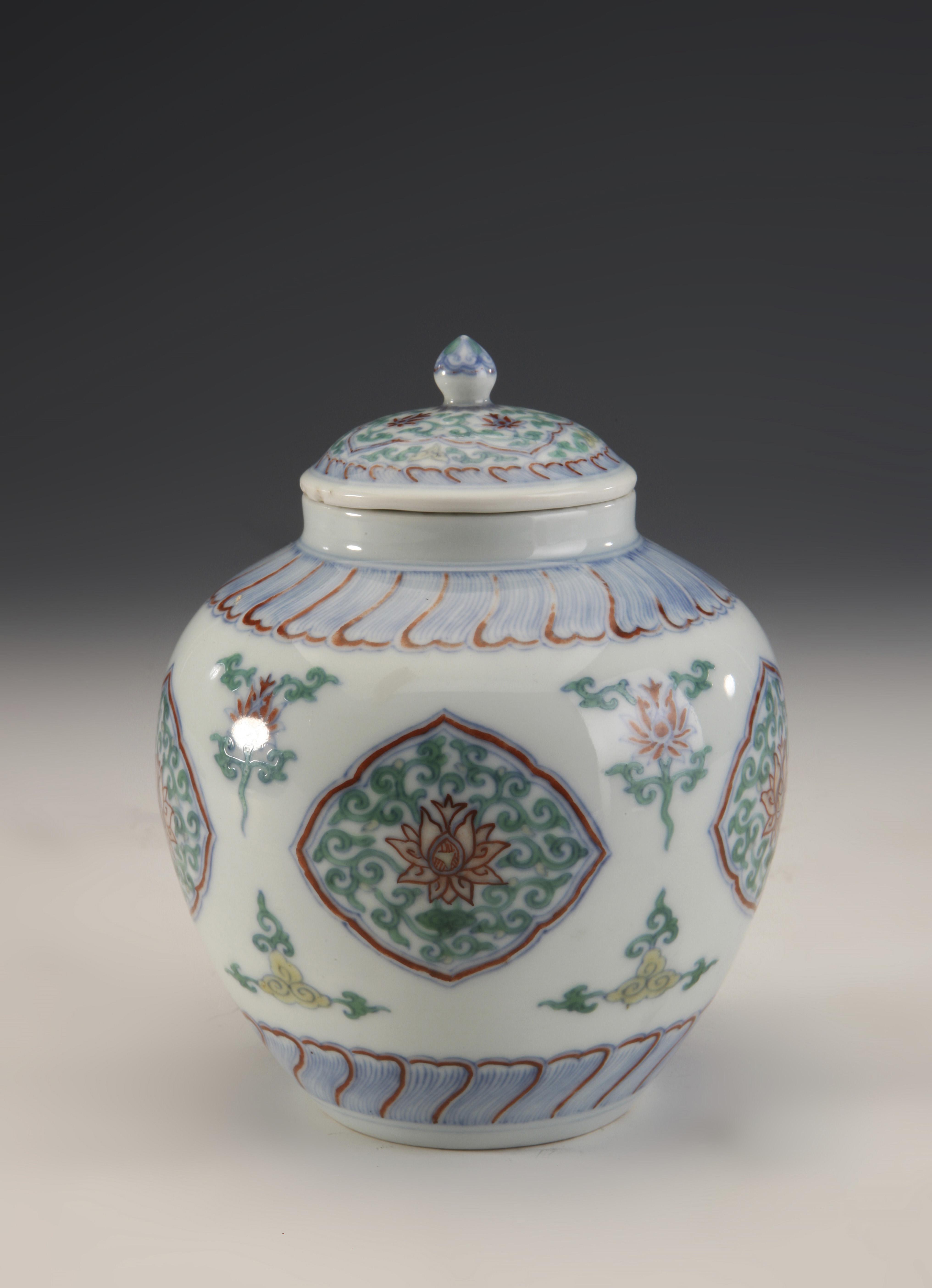 清雍正款斗彩团花盖罐