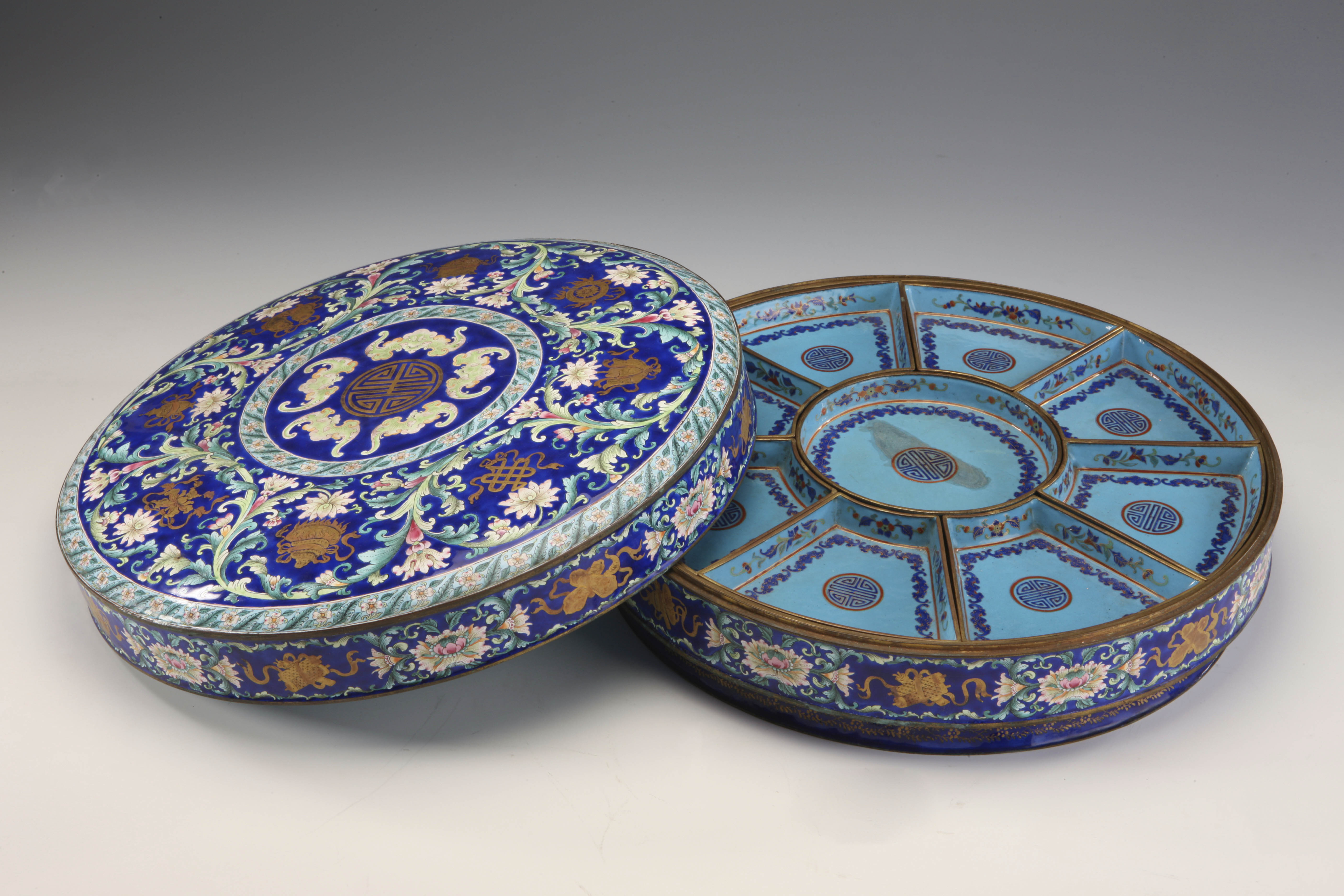 清乾隆铜胎画珐琅蓝地八宝花纹攒盒