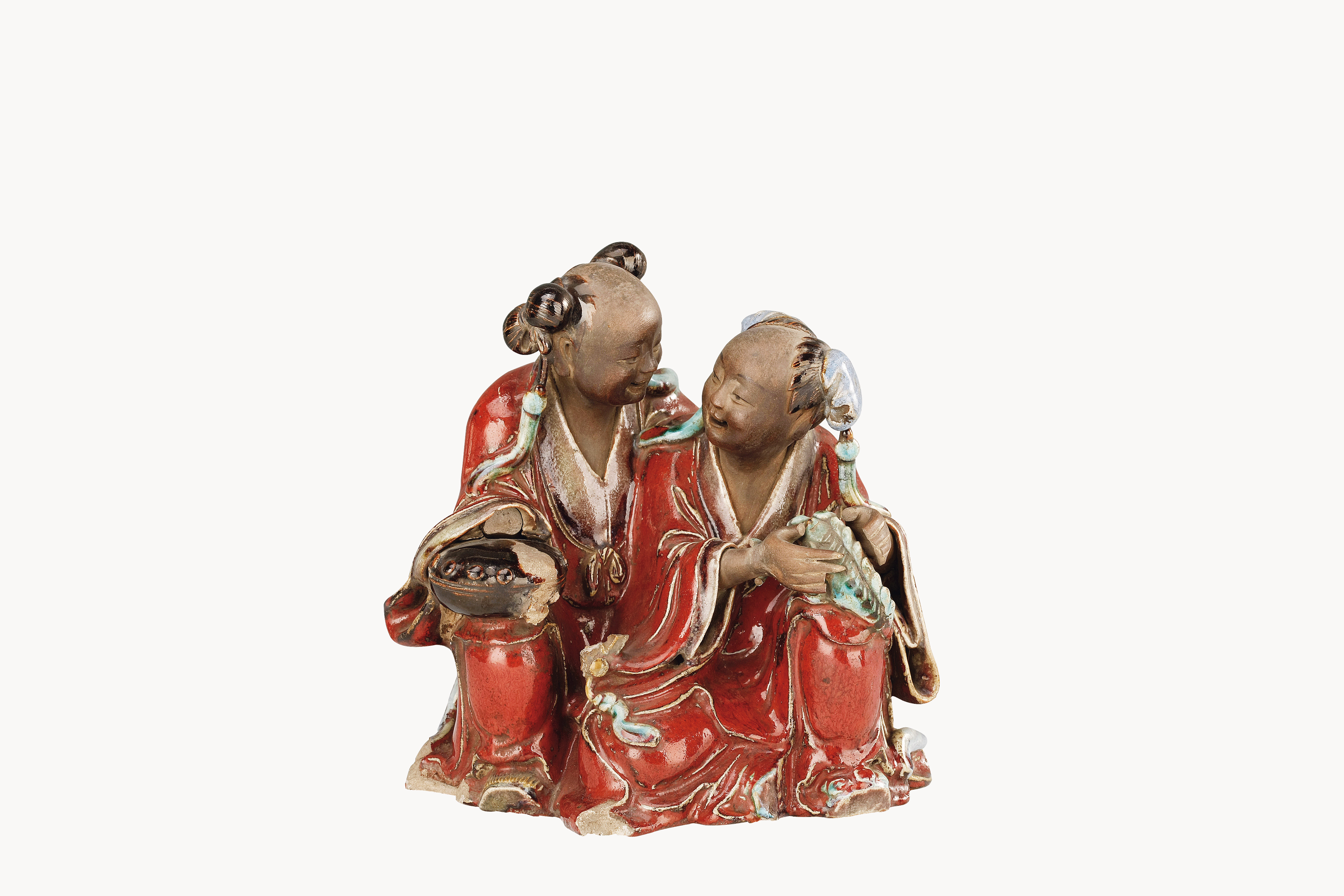 名称: 清石湾窑石榴红和合二仙 年代: 清代 类型: 陶器 质地: 陶 尺寸: 高22cm 来源: 广东省博物馆 和合二仙的典故相传源于唐代诗僧寒山、拾得,是我国民间传说中主婚姻和合之神。通常二人一人持荷花、一人持圆盒,取和谐合好之意。这尊陶塑,二人愉悦相对,人物表情生动,衣服纹理流畅。衣服所施石榴红釉艳丽而凝重,是石湾陶器最有特色的釉色品种之一。