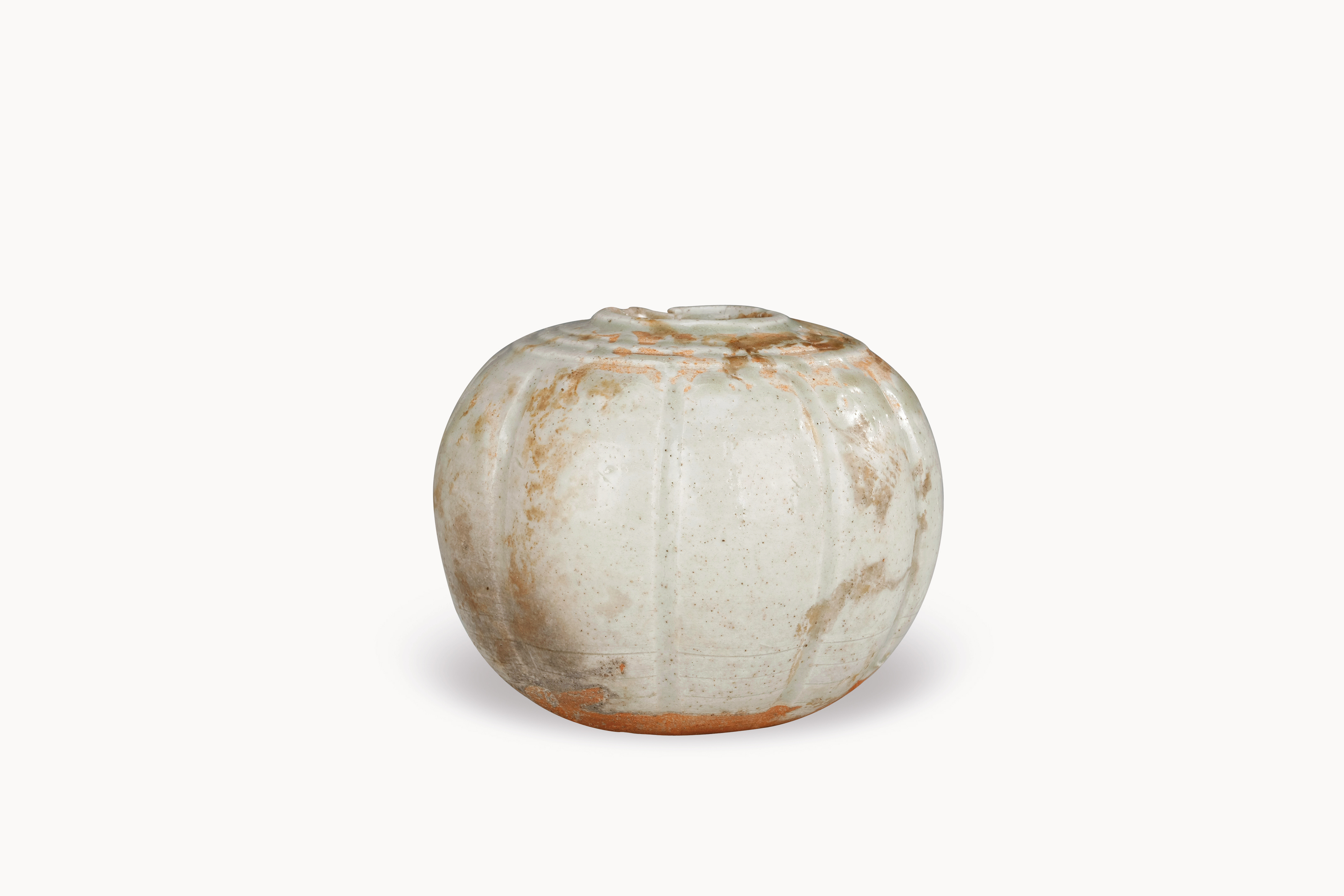 名称: 宋潮州窑影青瓜形瓷水盂 年代: 宋代 类型: 瓷器 质地: 瓷 尺寸: 高7.6cm、口径3cm、底径4cm 来源: 广东省博物馆 水盂小圆口、瓜形圆腹,通体施青白釉。这种瓜形的装饰风格是源于西亚地区金银器的影响。