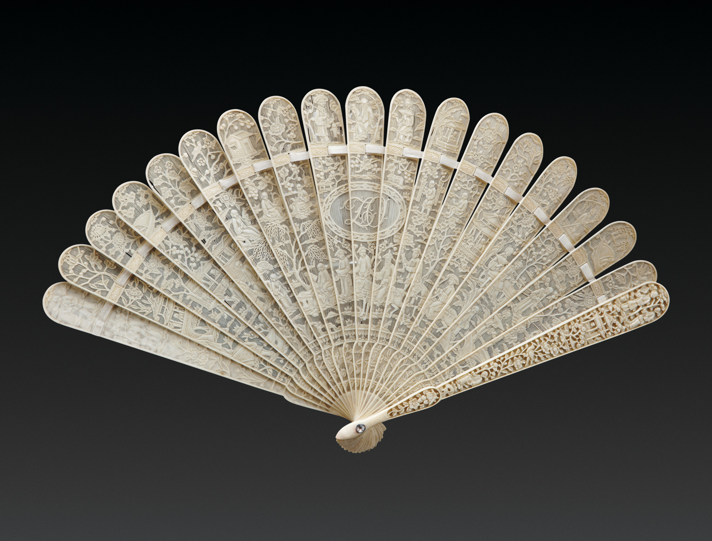 名称: 约1840年象牙通雕LO徽章纹庭园人物故事折扇 年代: 清 类型: 质地: 象牙 尺寸: 纵19厘米,横31.5厘米 来源: 广东省博物馆 十九档象牙扇骨。两大骨剔地浮雕花卉人物、亭台楼阁。扇面采用拉丝浅浮雕技法,分多层装饰。顶部饰以花卉、庭院、人物;中部主体拉丝浅浮雕官员巡游,柳亭人物;边饰辅以折枝花卉;扇面中心椭圆形开光内饰“LO”徽章纹,扇背光素。布局严谨,雕工精细。