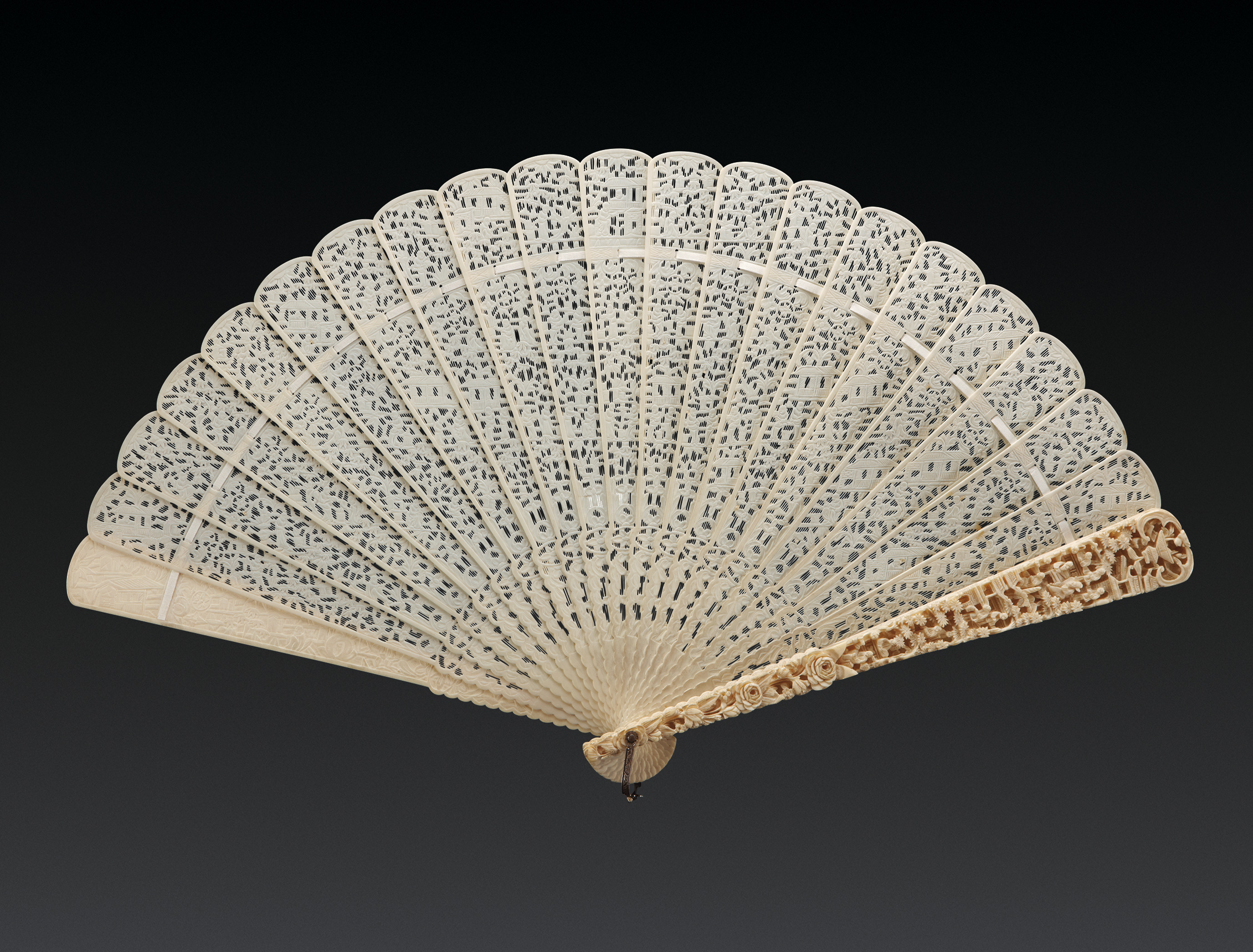 名称: 约1870年象牙双面透雕人物图折扇 年代: 清 类型: 质地: 象牙 尺寸: 纵23.4厘米,横41厘米 来源: 广东省博物馆 二十一档象牙扇骨。两大骨双面雕饰,采用镂通、高浮雕和薄意雕技法,由上而下分饰蝙蝠衔花、亭台人物、牡丹花卉。扇页双面工,纹饰相同。透雕拉丝锦地上浅浮雕折枝花卉、庭院人物。此扇通体满饰,无一空白。花丛草木、山石屋舍、人物形象,形态各异,惟妙惟肖。