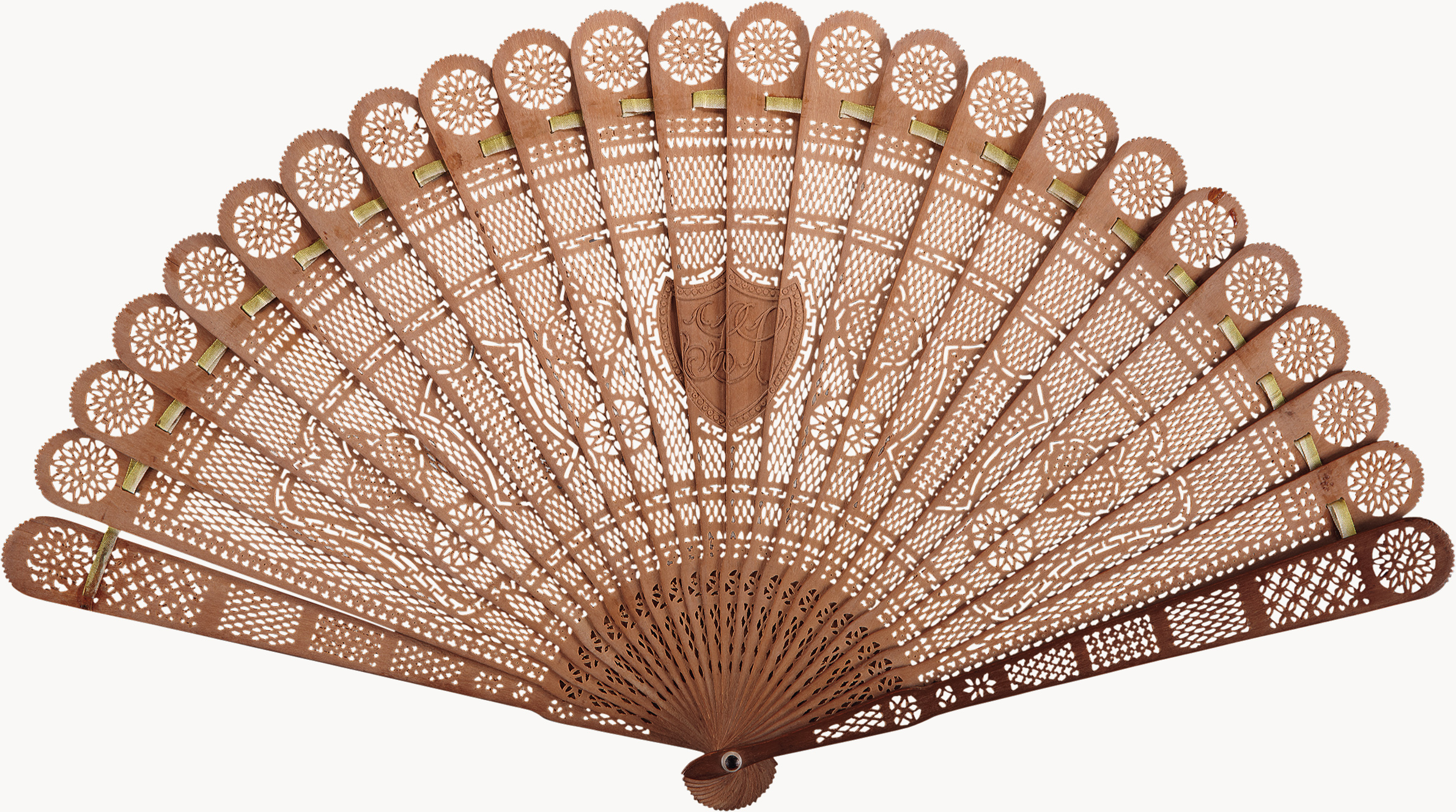 名称: 十九世纪檀香透雕徽章纹扇 年代: 清 类型: 工艺扇 质地: 木 尺寸: 纵20厘米,横35厘米 来源: 广东省博物馆 二十四档檀香扇骨。两大骨通雕花卉网格纹。扇面采用单面透雕技法,顶部饰圆形花卉;中部主体扇面形开光内饰对称网格纹;扇面中央浅浮雕盾形徽章纹样,扇背光素。雕工简洁明快,清新自然。