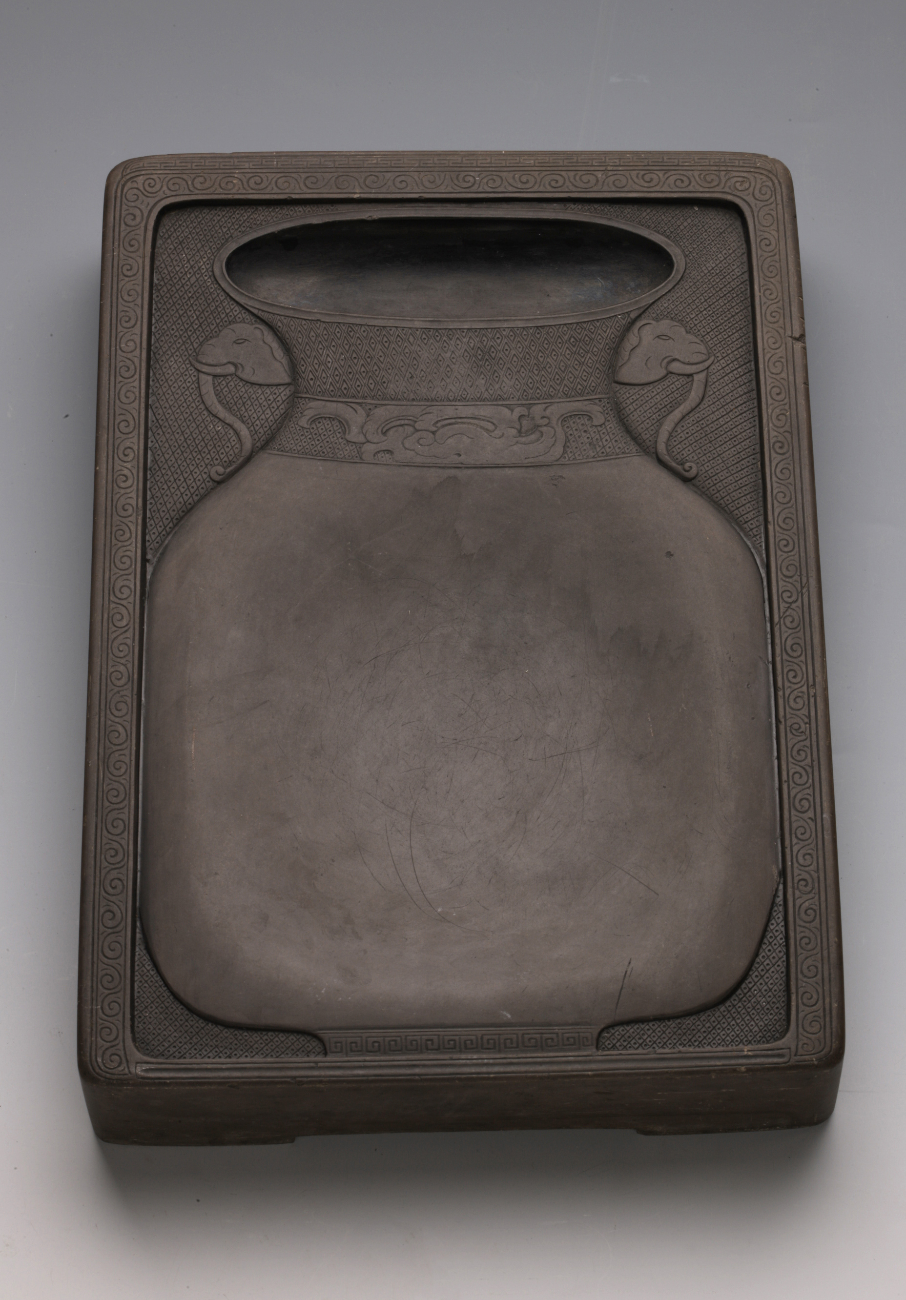 名称: 清康熙端石瓶池长方砚 年代: 清康熙(公元1662-1722年) 类型: 质地: 石 尺寸: 长30cm 宽20.5cm 厚4.3cm 来源: 广东省博物馆 宋坑石。石质润滑致密,色紫偏青黄。有马尾火捺。砚面镌象耳瓶纹,瓶身为堂,瓶口为池。地衬方格纹,砚唇饰卷草纹。砚背出四足,中部微凹。