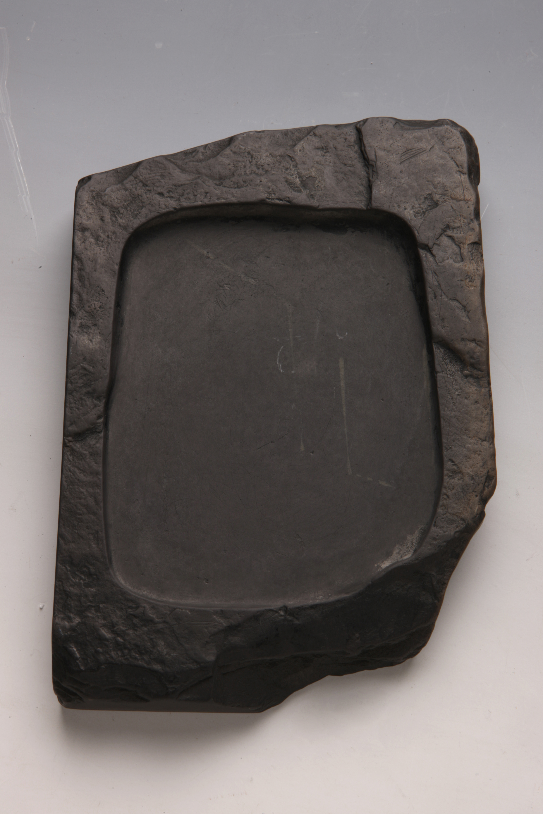 名称: 清谢兰生铭端石砚 年代: 清嘉庆至道光(公元1796-1850年) 类型: 质地: 石 尺寸: 长19.3cm 宽13.3cm 厚2.5cm 来源: 广东省博物馆 杂坑石。色青紫带黄。砚左侧有铭文:“重岩中,足清风。扇不摇,凉气通。明月照,白云笼。独自坐,一老翁。寒山大士句,里甫居士书为研铭。”砚背随自然形状巧雕山中面壁图。 谢兰生(1759-1831),字佩士,号澧浦、里甫,广东南海人。克承家学,主持越秀、越华、端溪等书院。工诗善画,尤精鉴别。