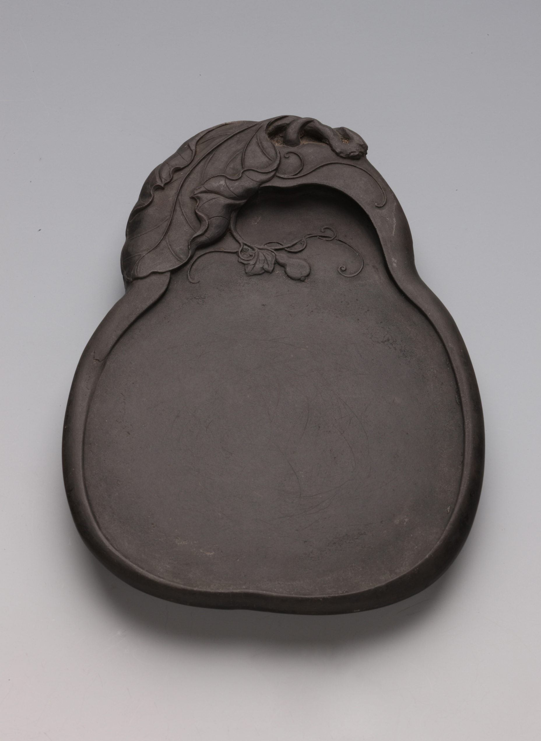 名称: 清雕葫芦椭形砚 年代: 清嘉庆至道光(公元1796-1850年) 类型: 质地: 石 尺寸: 长16cm 宽11.7cm 厚1.5cm 来源: 广东省博物馆 坑仔岩石。石质滋润。色青紫稍带赤。砚背微有蕉白、火捺。砚面雕葫芦瓜形,自然美观。