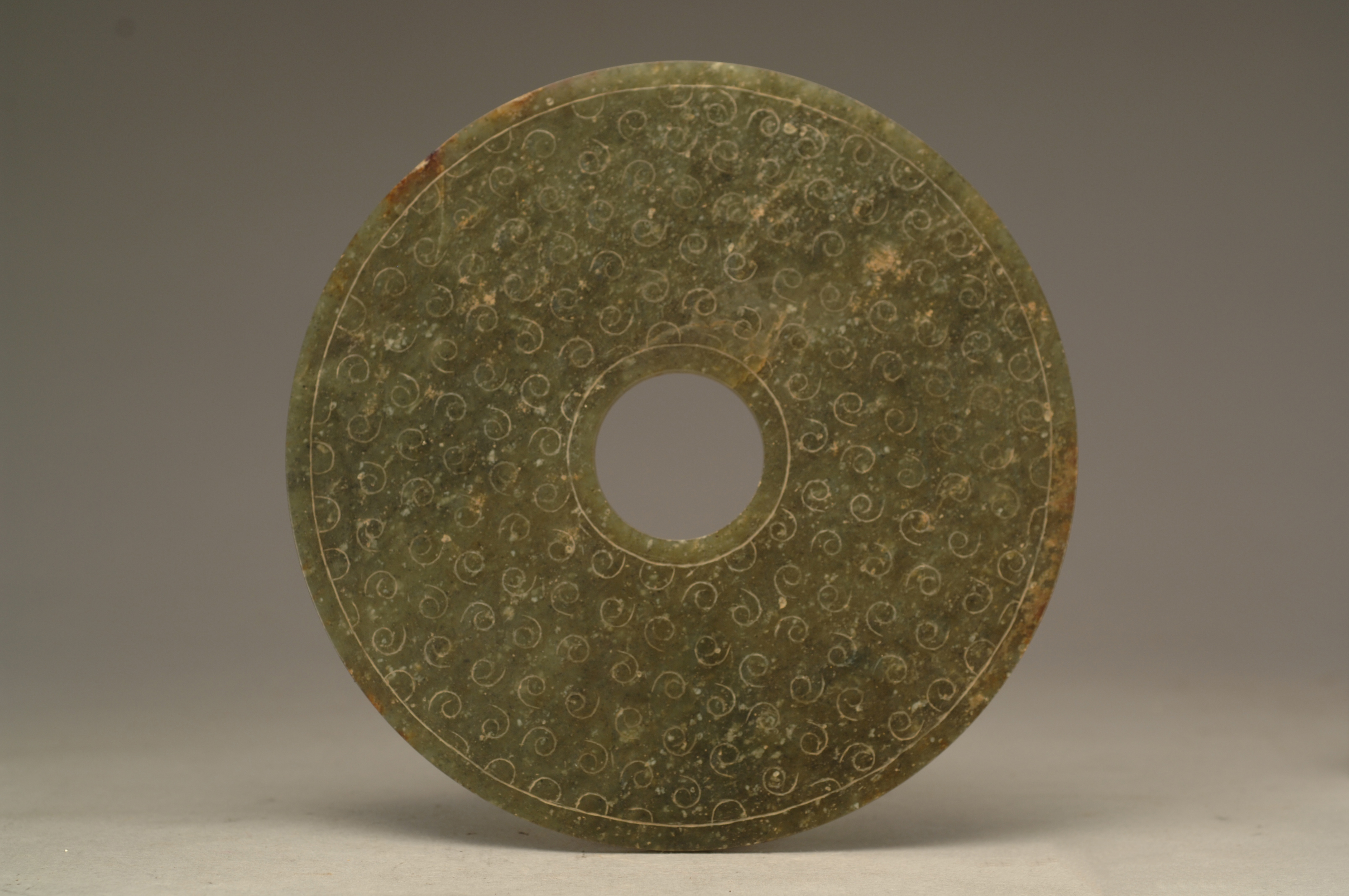 名称: 汉碧玉卧蚕纹璧 年代: 汉 类型: 质地: 宝玉石 尺寸: 外径16.7厘米 内径3.6厘米 来源: 广东省博物馆 圆形片状,中心有圆孔,孔(好)径小于肉径。璧的两面琢相同的纹饰,孔内廓和璧外边缘各阴刻弦纹一圈,两弦纹圈内推磨琢饰六边形蒲纹,并在蒲纹内阴刻谷纹。