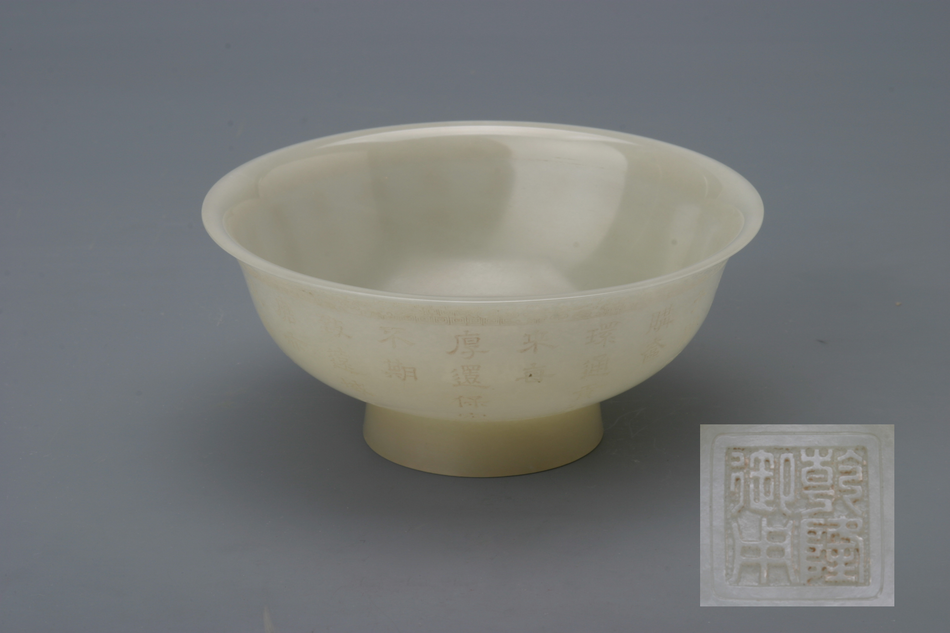 名称: 清乾隆款白玉碗 年代: 清乾隆 类型: 质地: 宝玉石 尺寸: 高3.2厘米 口径5.6厘米 来源: 广东省博物馆 撇口,腹微鼓,圈足。碗的口沿和碗腹近底足处各琢饰一圈夔龙纹,其间阴刻隶书乾隆御制诗铭文。碗底圈足内管钻阳文篆书“乾隆御用”方形印。此碗玉质莹润,琢工精细,文字工整。