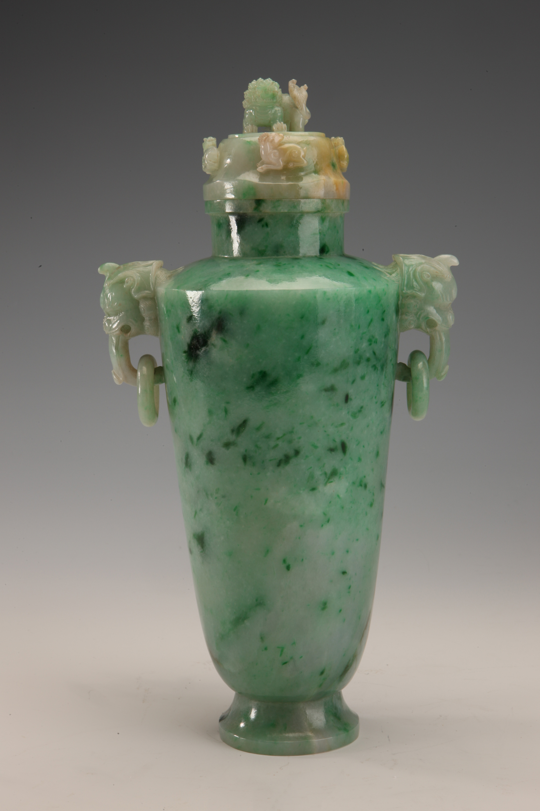 名称: 民国翠玉双龙耳活环狮羊盖瓶 年代: 清晚期 类型: 质地: 宝玉石 尺寸: 高27.5厘米 口径6厘米 底径6厘米 来源: 广东省博物馆 由盖、身两部份组成。体圆,直口,短颈,口平折沿,肩微鼓起,腹部上大下小,往下渐收,圈足。盖钮雕狮子,盖的斜面上浮雕四只回首的羊。瓶上身浮雕双龙衔活环耳。