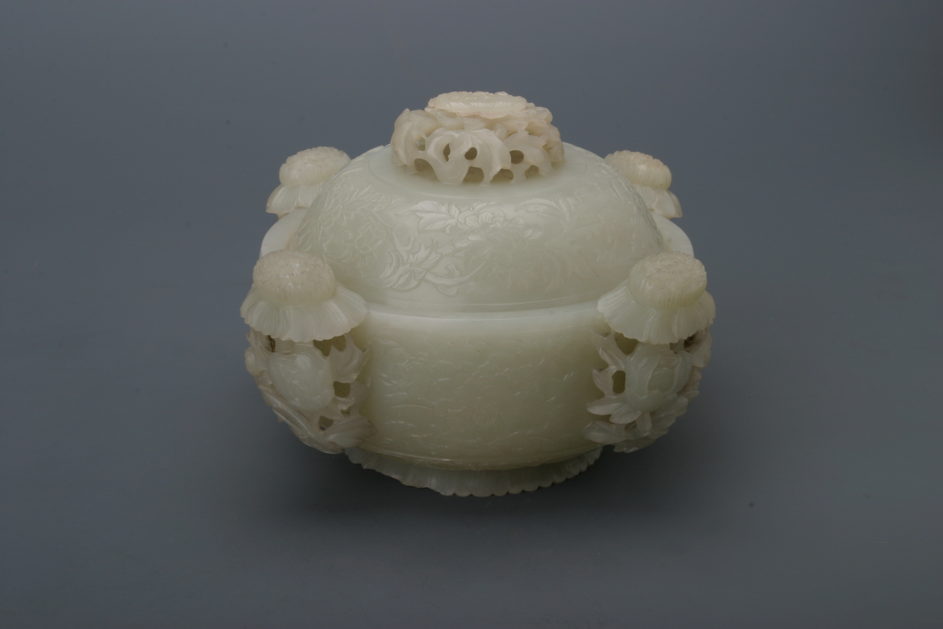 名称: 清乾隆青玉四花耳盖炉 年代: 清乾隆 类型: 质地: 宝玉石 尺寸: 高11厘米 口径13厘米 底径8.4厘米 来源: 广东省博物馆 以圆雕、剔地隐起浅浮雕、镂通雕和阴刻等技法琢制。由炉身、盖两部份扣合而成,直口,腹微鼓。炉身外壁和盖面浅浮琢饰折枝花卉,炉身对等镂通雕四个折枝花作耳,炉身底部和足边均琢饰莲瓣纹。盖的顶部镂通雕折枝花作盖钮,底足雕为盛开的菊花