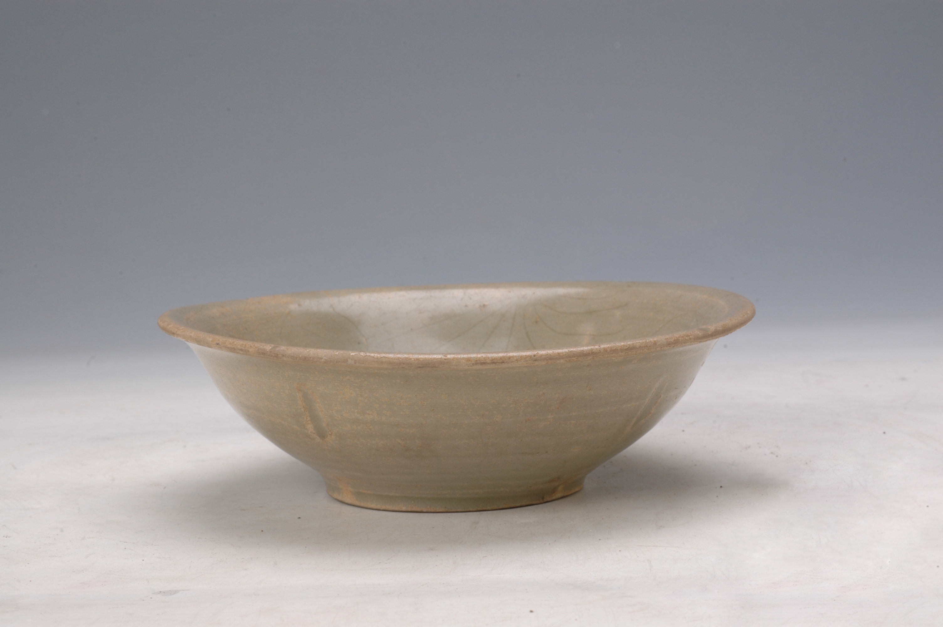 名称: 唐越窑青釉暗花小碗 年代: 唐 类型: 质地: 尺寸: 高3厘米 口径14.2厘米 底径6.1厘米 来源: 广东省博物馆 四瓣口,小折沿,矮圈足。碗内刻划水草暗花,外壁刻四直凹线,通体施青釉。越窑为唐代青瓷系的代表,在全国范围内形成“南青北白”相对峙的局面。所谓南青北白是南方以越窑为代表的青瓷著称于世,北方则以邢窑为代表的白瓷驰名中外。