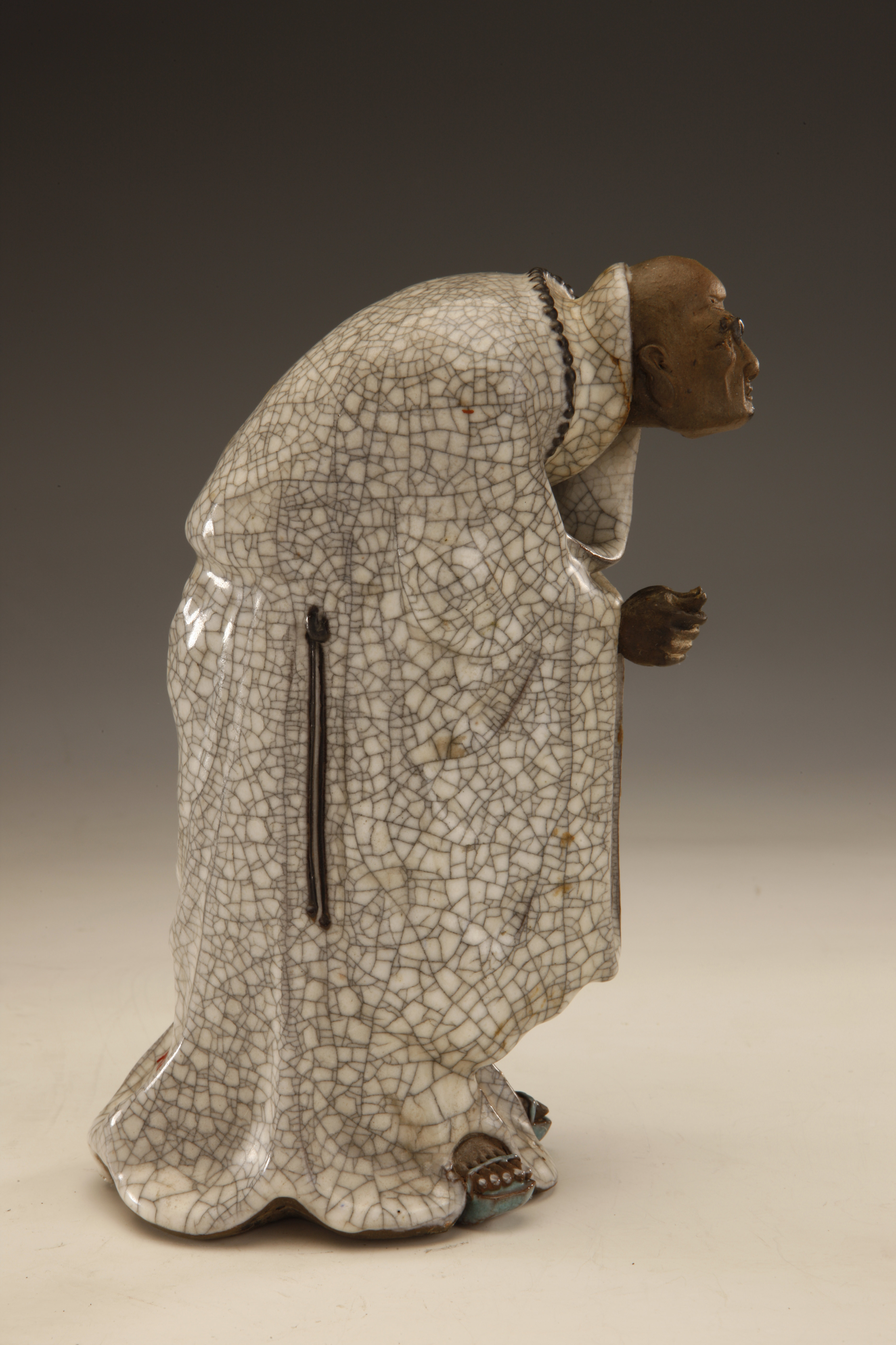 名称: 清末石湾窑仿哥釉米芾拜石像 年代: 清末 类型: 质地: 尺寸: 高16.5厘米 来源: 广东省博物馆 作品人物采用夸张的手法塑制而成。衣袍施用仿哥窑釉彩,脸部和裸露的肌体采用胎骨。作品底部用刀刻画行书阴文长条款识“刘胜记”和“刘佐朝作”。