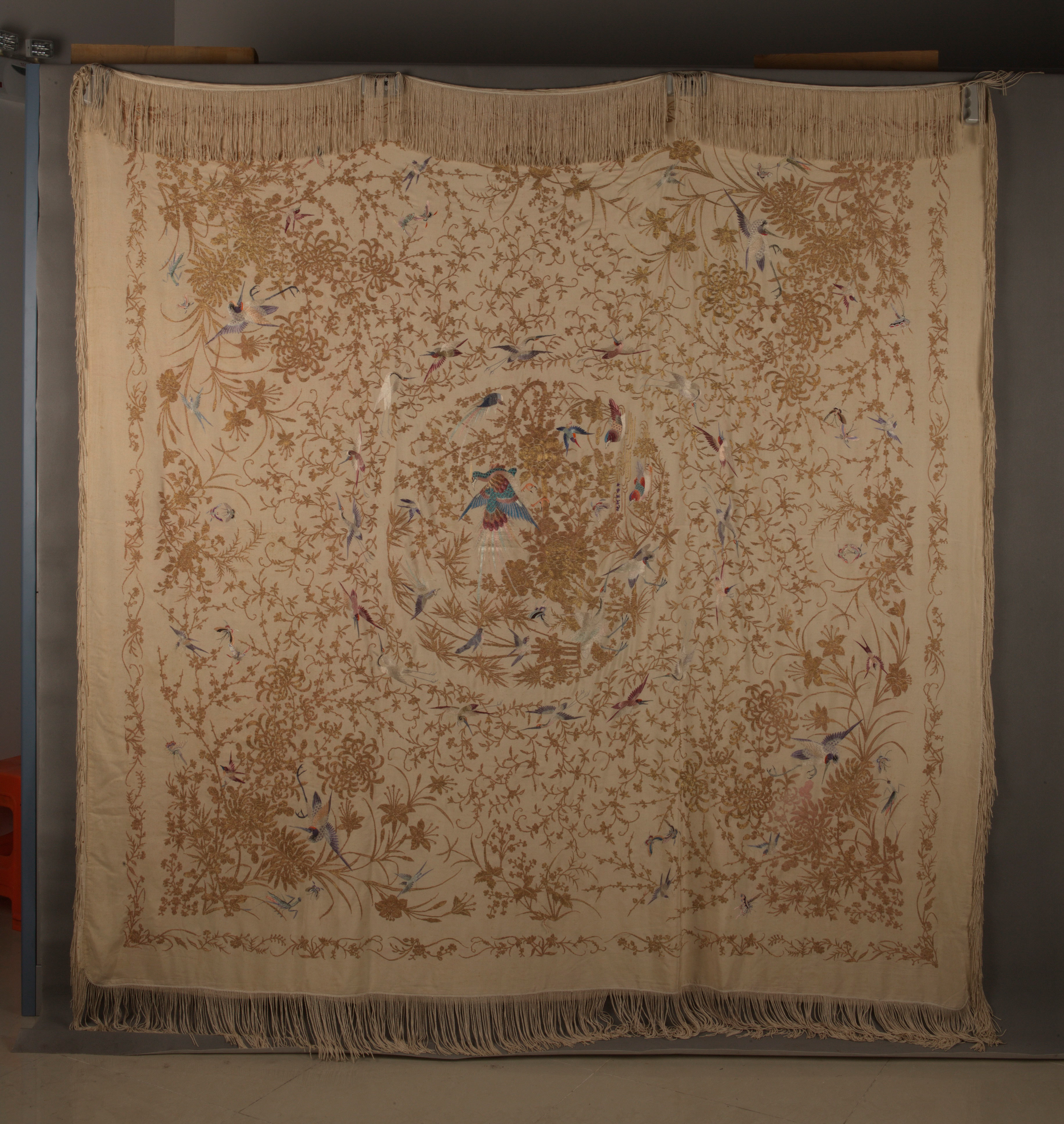 名称: 清米色绸地广绣排金花卉百鸟图床罩 年代: 19世纪 类型: 质地: 丝绸 尺寸: 纵240厘米,横240厘米 来源: 广东省博物馆 床罩以西式造型、中式纹样为特色。床罩四角排金绣折枝菊花图案,辅以枝蔓舒卷的碎花铺满整个空间,每一束花丛中又有五彩丝线绣制的仙鹤、黄莺、蝴蝶、螳螂等虫鸟穿飞其间。床罩居中处圆形开光内排金绣牡丹、荷塘、翠竹、梅花,五彩丝线绣凤凰、仙鹤、鸳鸯、鹡鸰、黄莺等珍禽构成“五伦图”。池塘水波处紫色丝线绣“卑爹累柯地”字样,应为西方订购者名字的译音。