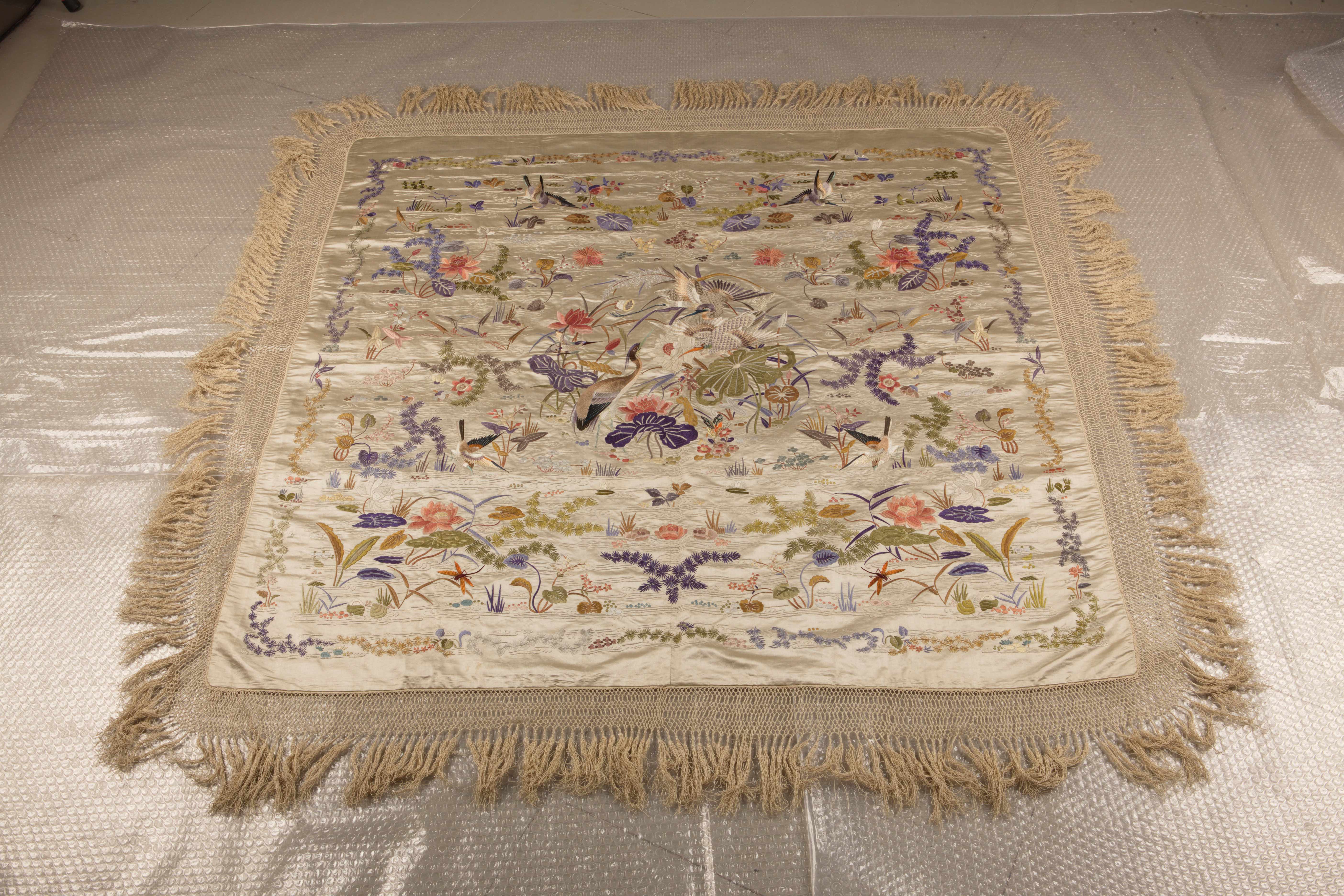 名称: 米色绸地广绣荷塘鸳鸯纹台布 年代: 19世纪 类型: 质地: 丝绸 尺寸: 纵138厘米,横135厘米 来源: 广东省博物馆 装饰桌面的绣件,以米色缎为地,彩绣荷塘清趣图案。绣件居中处莲叶、荷花、鸬鹚等纹样簇拥成团花状,取“一路清廉”之寓意。外围图案呈对称布局,水波海草、莲叶荷花、翠鸟蜻蜓成双成对,相映成趣。整件绣品色调清新,图案题材有别常规,是西方来样定制的一件桌面装饰品。