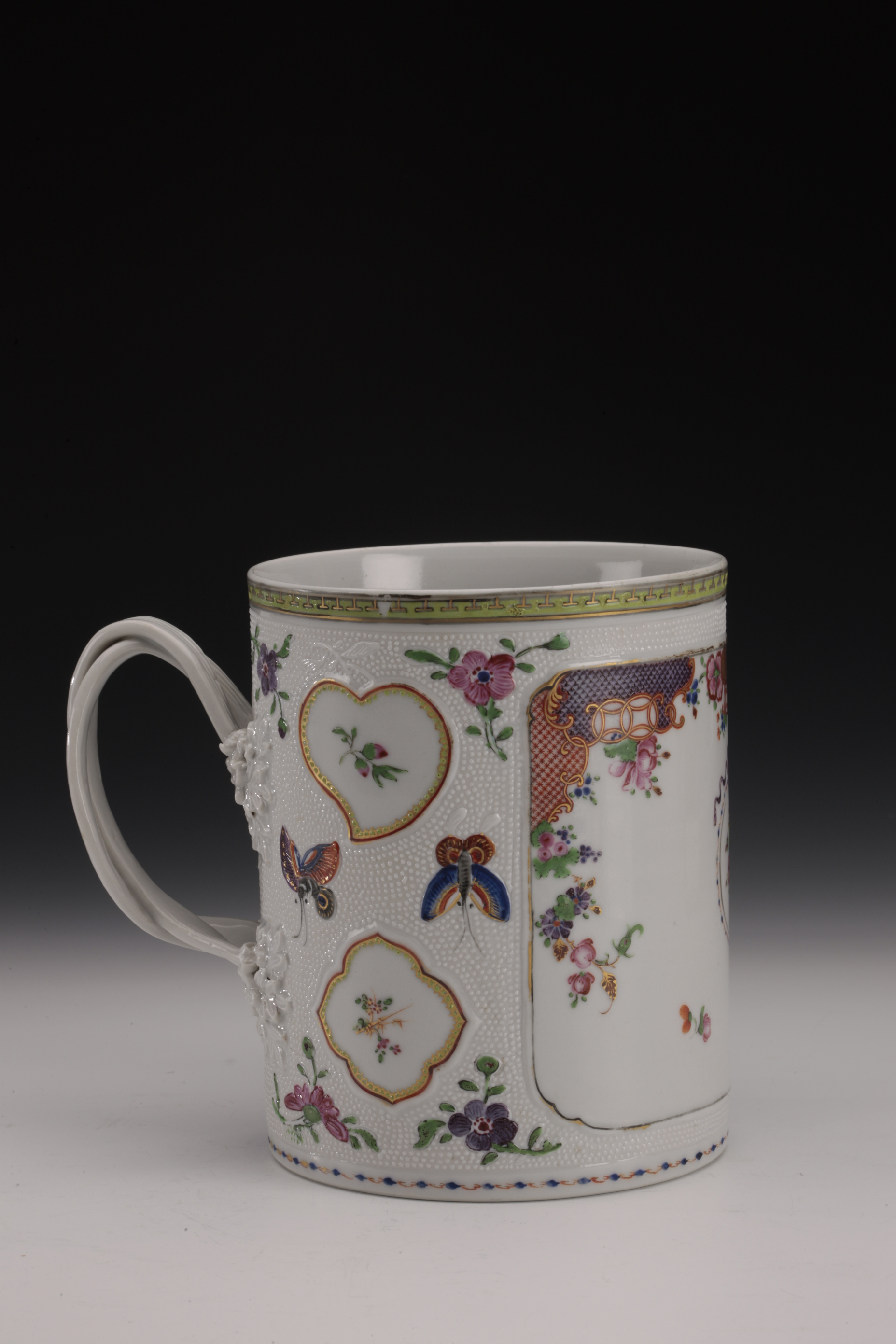 名称: 清广彩珍珠地徽章纹马克杯 年代: 清乾隆 类型: 质地: 尺寸: 高15.2 厘米,口径12 厘米,底径11.8 厘米 来源: 广东省博物馆 直口,圆柱形身,平底。杯身一侧饰半环形把手,把手与杯身连接处堆塑花瓣。杯口沿下绘绿地金彩锦带纹周,杯身近底处绘连云纹一周。杯身为珍珠地,衬以花蝶纹,腹部开光绘花卉图案。纹饰均采用红、紫、蓝。绿、金彩,色彩丰富明亮,画面清新雅致。马克杯是从英文“mug”音译而来,是西方家庭常用杯子的一种。用来喝啤酒或麦芽酒。