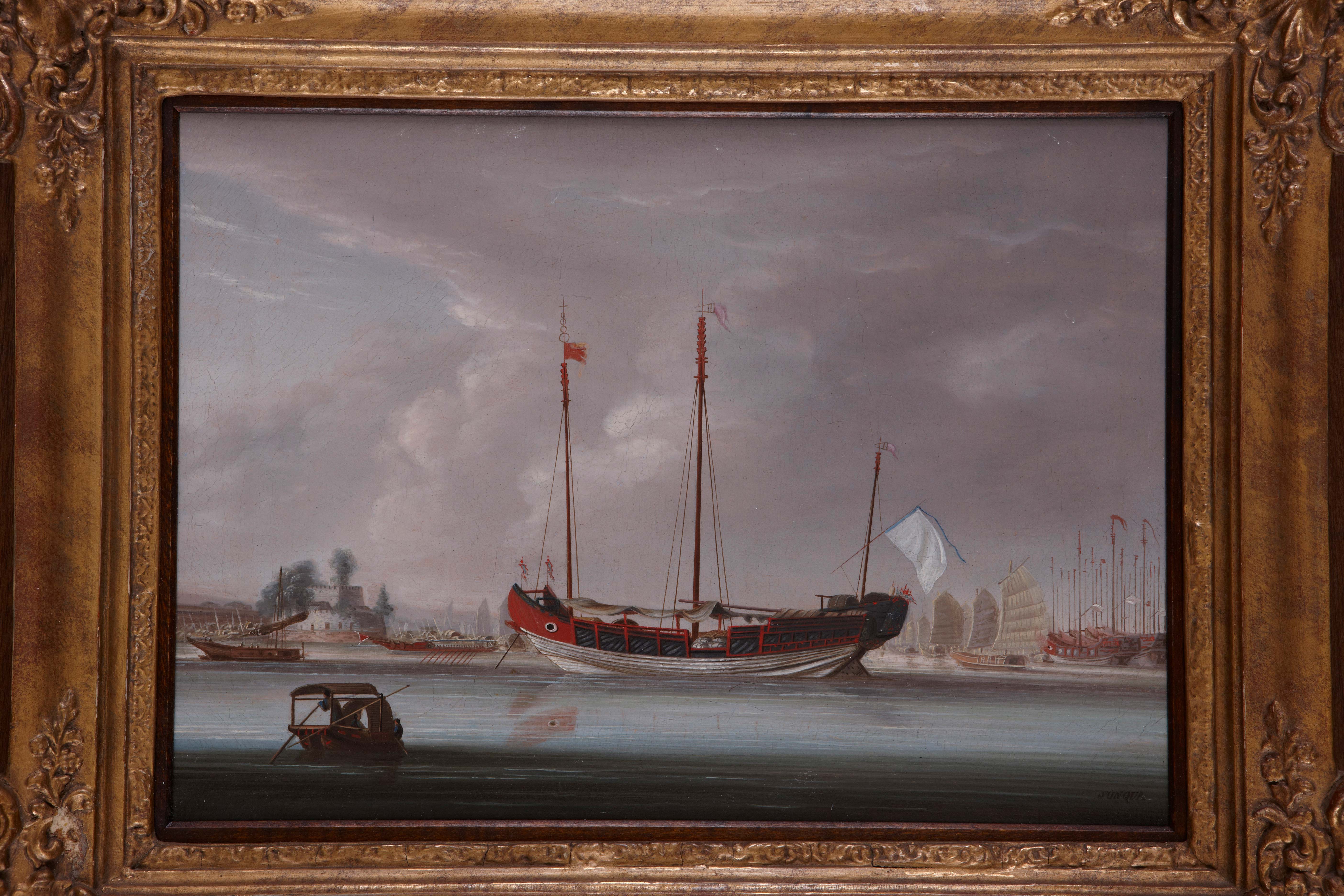 新呱(Sunqua),活跃于1830 年-1870 年,广州知名外销画家,擅长油画。题材多为商埠景色、船只等,也面画水彩小品,作品多有英文“SUNQUA”签名,但更常见的是将英文签名的标签贴于画架或画册上,1857年后其画室在香港开设分店。鸦片走私船又称“快蟹”或“扒龙”,是走私鸦片的主要船只。1834 年东印度公司对华贸易特权被取缔之后,鸦片的走私贸易转移到珠江入海口的伶仃洋附近。欧洲走私商将鸦片卸在停泊于伶打洋的趸船上,中国商人再用“快蟹”将鸦片转运到广州及东南沿海的各个城市。此画面正是这一史实的真实再现。画作线条流畅,绘制技巧纯熟,充分体现出画家擅长运用近景与中景的阴暗对比来体现水流的明快质感并拉开空间层次的绘画特点。