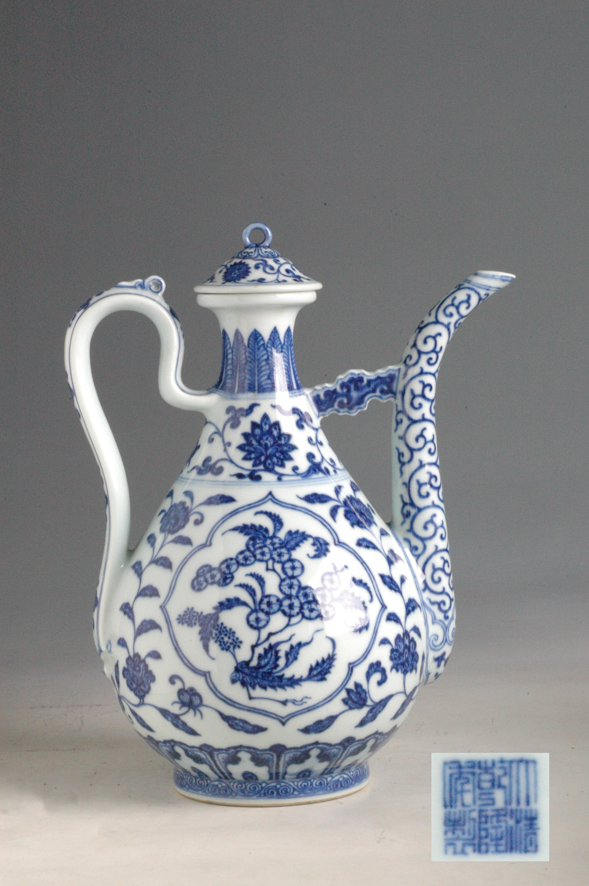 壶身作玉壶春瓶式,敞口,削肩,鼓腹,圈足。一侧有外撇细长流,流与颈之间以一横片相连,另一侧附曲形长柄,柄顶端有一系孔,此孔与盖钮可穿绳连接。腹部饰四曲菱形开光,开光内绘折枝花果纹,开光外绘折枝花 纹。颈部、胫部和圈足分别绘蕉叶纹、折枝花纹及水波纹。底部以青花书” 大清乾隆年制”篆书方款。此器型秀美,白釉晶莹透澈,青花发色明亮,局部花纹以重笔点染,以模仿永乐“苏麻离青料”的效果。玉壶春瓶样式执壶,其样式和纹样均仿自明代官窑,清代各朝官窑多有仿制,以乾隆朝生产较为多见。