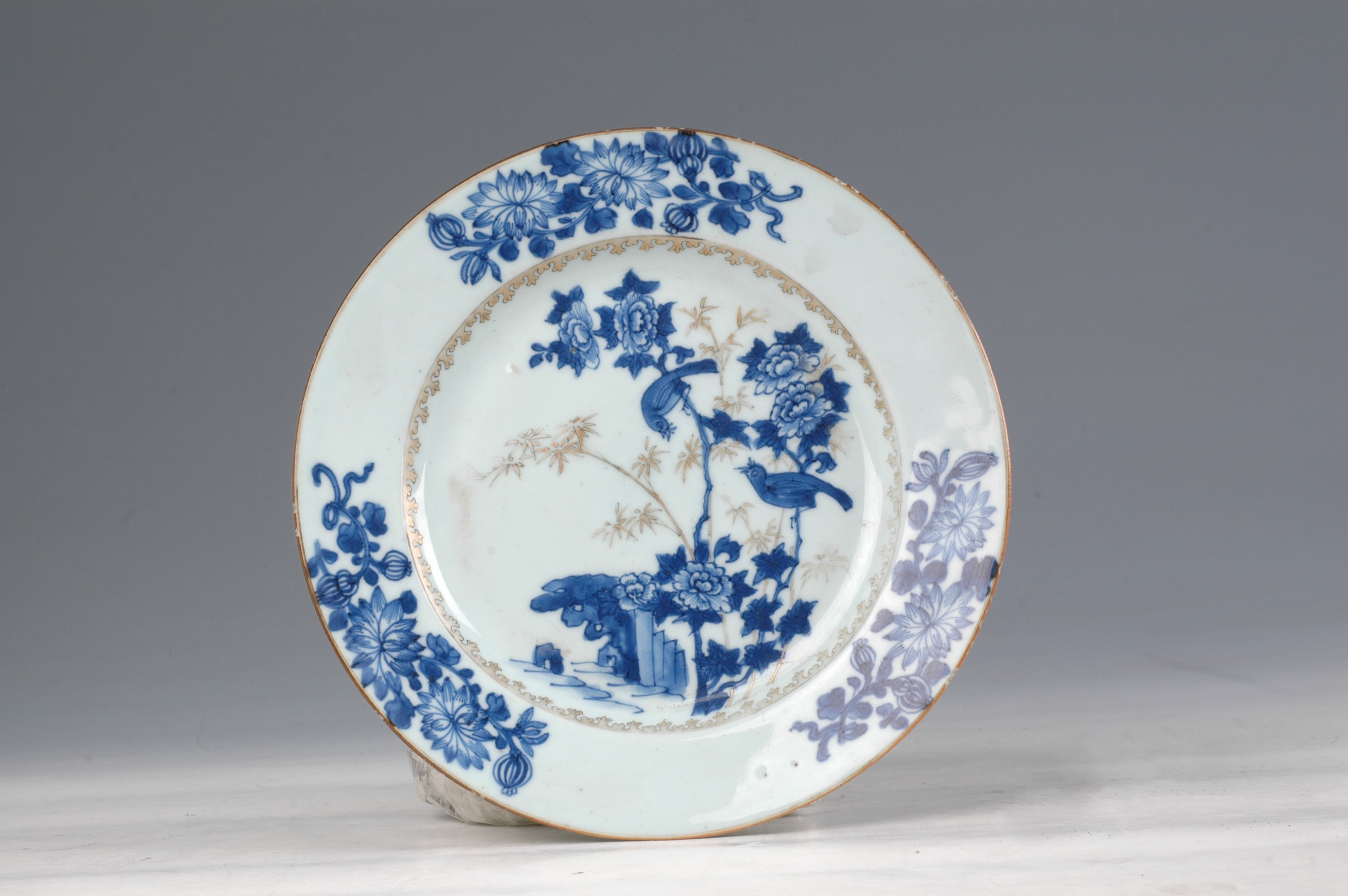 名称: 清乾隆青花描金花鸟盘 年代: 清·乾隆 类型: 质地: 尺寸: 高2.5厘米,口径23厘米,底径12.1厘米 来源: 广东省博物馆 盘板沿,折腰,浅腹,矮圈足。盘内圈饰金彩璎珞纹一周,内心以青花绘雉鸡牡丹图,金彩绘树叶纹。板沿边饰三组折枝花卉纹,这种边饰大约流行于18世纪40年代。