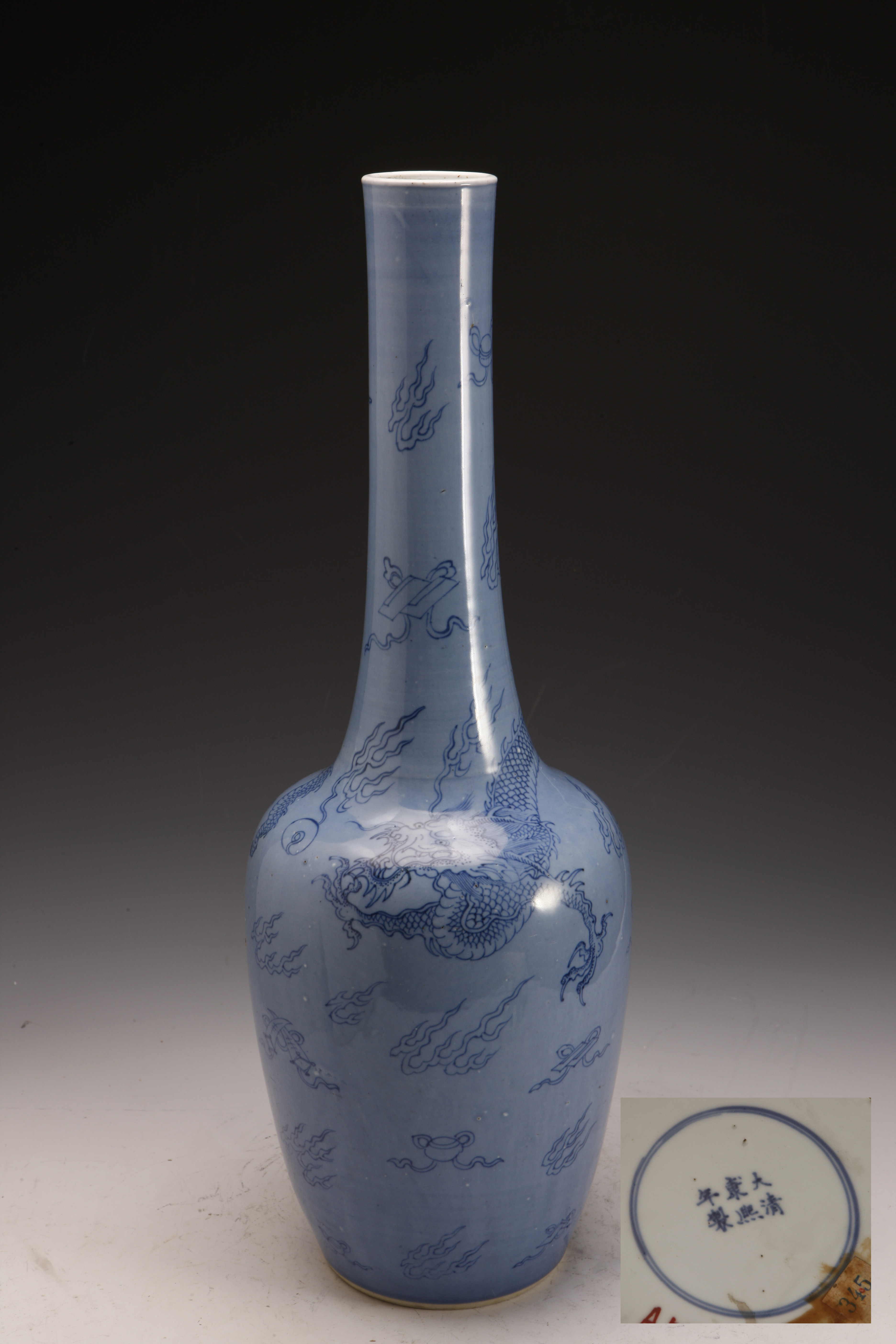 名称: 清康熙款官窑蓝地青花龙纹锥把瓶 年代: 清·康熙 类型: 质地: 尺寸: 高50.7厘米,口径5.7厘米,底径1.3厘米 来源: 广东省博物馆 天蓝釉青花,在瓷胎上先用青花钴料绘画,再罩一层浅蓝色釉,经高温烧成。天蓝釉,创烧于清代康熙年间。釉色浅蓝,莹洁清雅,像蔚蓝的天空,故名天蓝釉。天蓝釉含有1%以下氧化钴,釉料中的铜、铁、钛等金属元素均起呈色剂的作用。清代康熙时期所烧的天蓝釉,色调淡雅,釉面匀净莹润。
