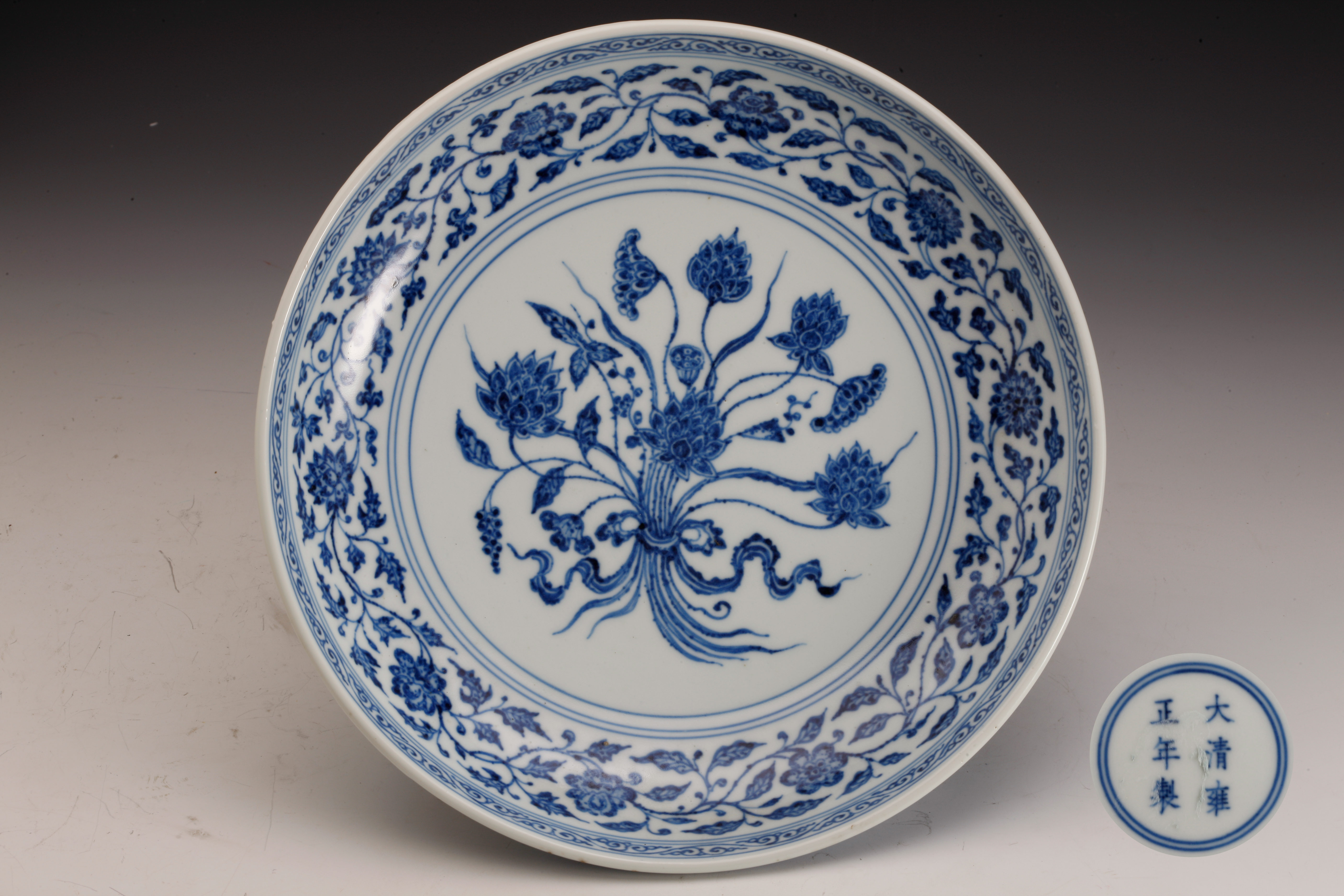 名称: 清雍正款青花把莲盘 年代: 清·雍正 类型: 质地: 尺寸: 高5.8厘米,口径26.9厘米,底径17.7厘米 来源: 广东省博物馆 盘敞口,弧形腹,圈足。盘内心绘把莲纹,腹外绘花卉纹。足内青花书写“大清雍正年制”双圈楷书款。雍正帝对永宣青花情有独钟,多有仿制。但仿品缺乏永宣时期自然豪迈的气韵,青花亦没有永宣青花自然晕散、黑铁斑点的特征。上面的斑点为人工点加。