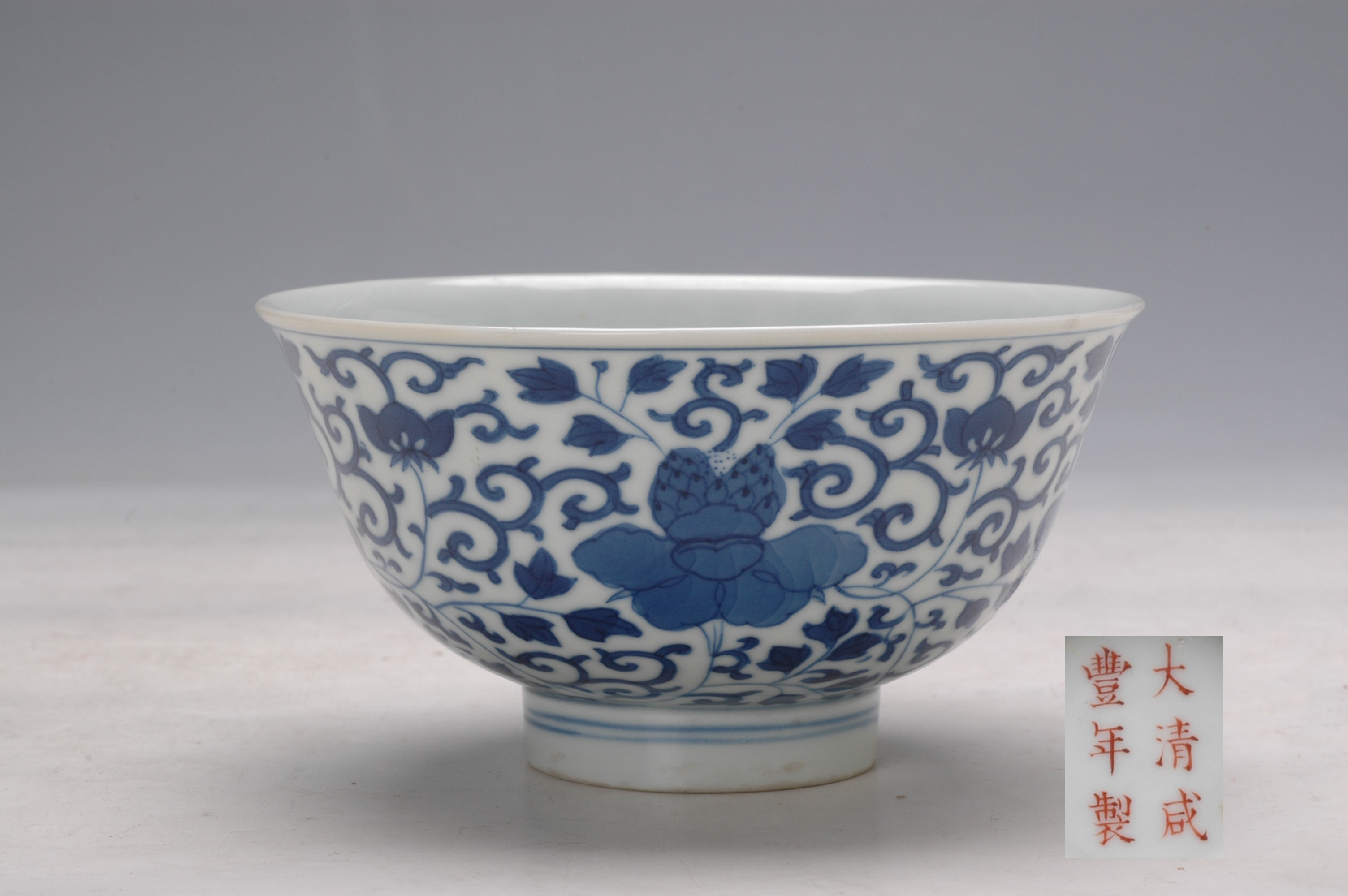 名称: 清咸丰款青花缠枝花碗 年代: 清·咸丰 类型: 质地: 尺寸: 高6厘米,口径11.5厘米,底径4.6厘米 来源: 广东省博物馆 碗敞口,深弧腹,圈足。碗内壁素面无纹,外壁饰缠枝蓬纹,底部以矾红彩书“大清成丰年制”楷书款。此碗规整精巧,白釉法润,青花发色典雅。