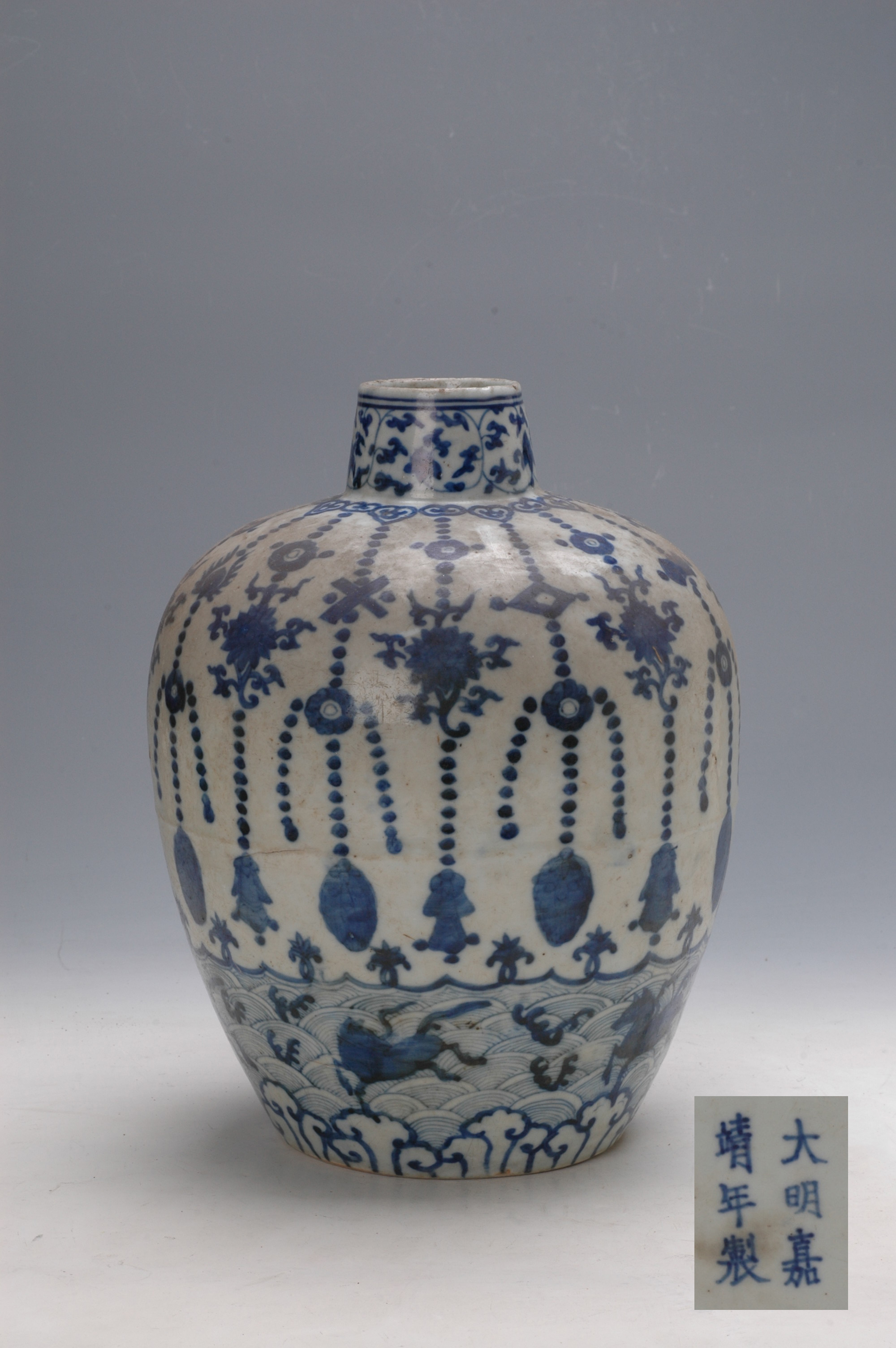 - 名称: 明嘉靖款青花海婴络纹罐