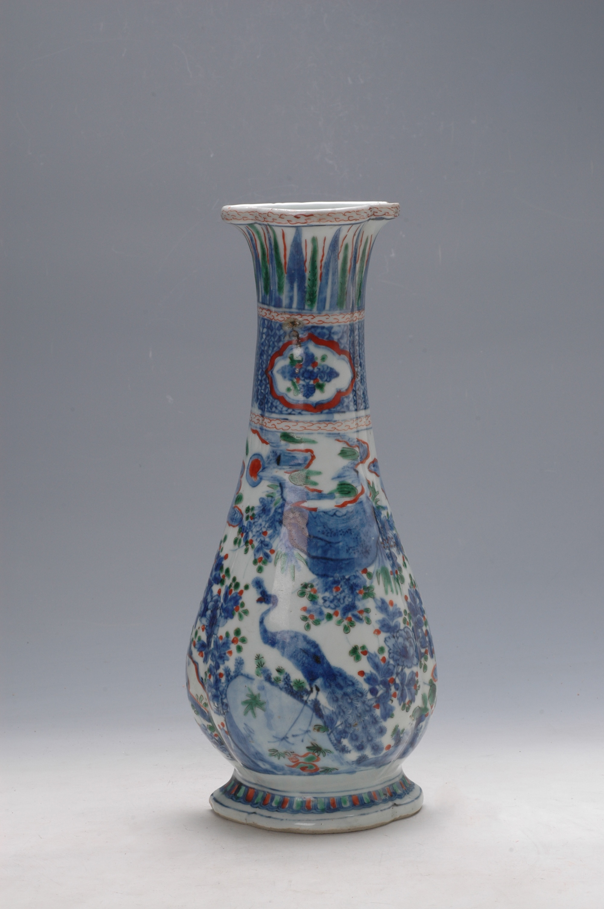 名称: 明万历仿宣德款青花红绿彩壁瓶 年代: 明·万历 类型: 质地: 尺寸: 高29.9厘米,口径8.7厘米,底径10.6厘米 来源: 广东省博物馆 青花红绿彩在明代彩瓷装饰中较为少见,其制作工艺是先烧成青花瓷,再添红彩或者绿彩,二次烘烤而成,属于釉上彩与釉下彩相结合的彩光。